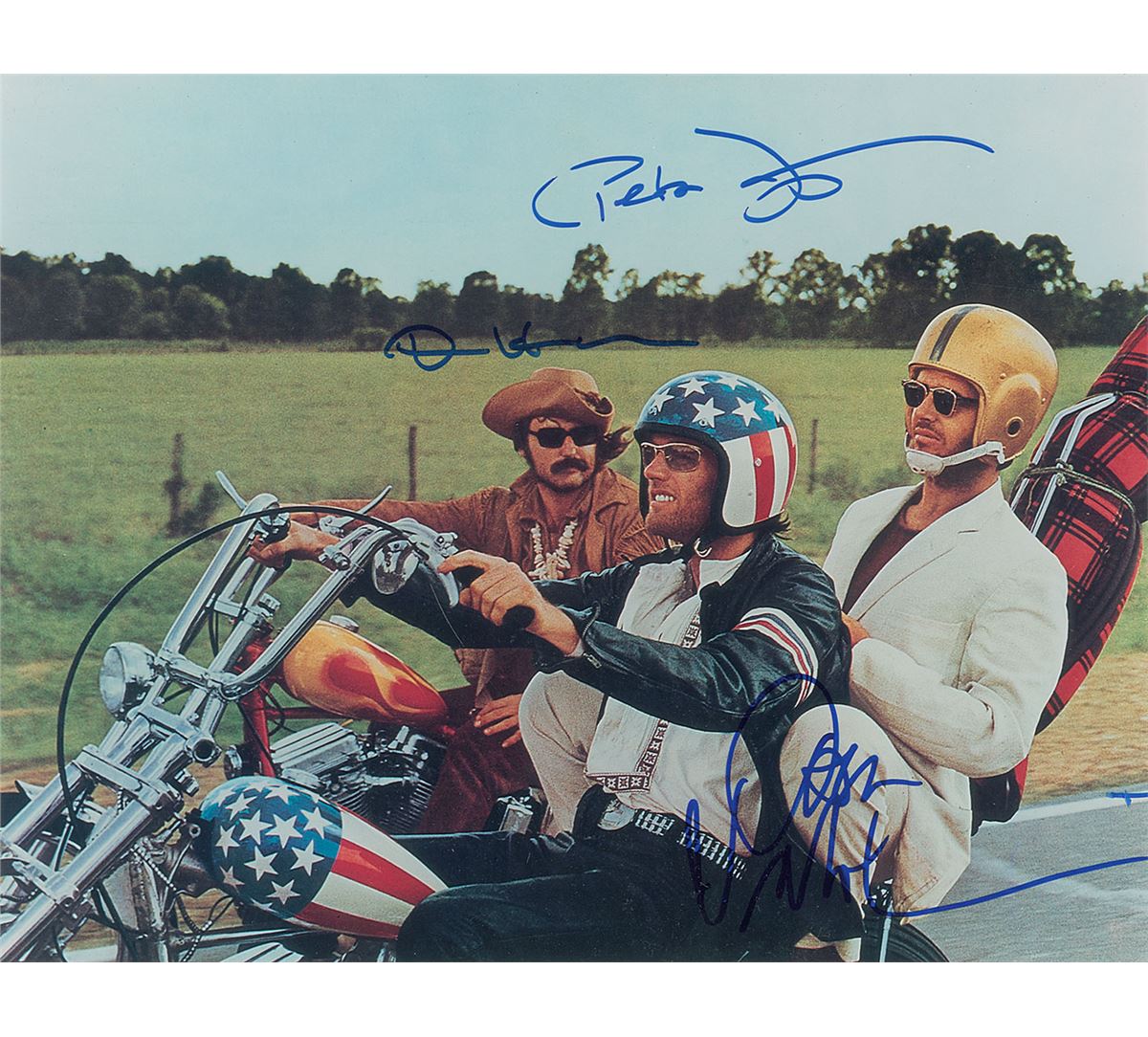 Color satin-finish 14 x 11 photo from the 1969 American road classic Easy Rider, signed in blue felt tip by Dennis Hopper, Peter Fonda, and Jack Nicholson. In fine condition. Originally obtained by in-person specialist Mike Wehrmann.