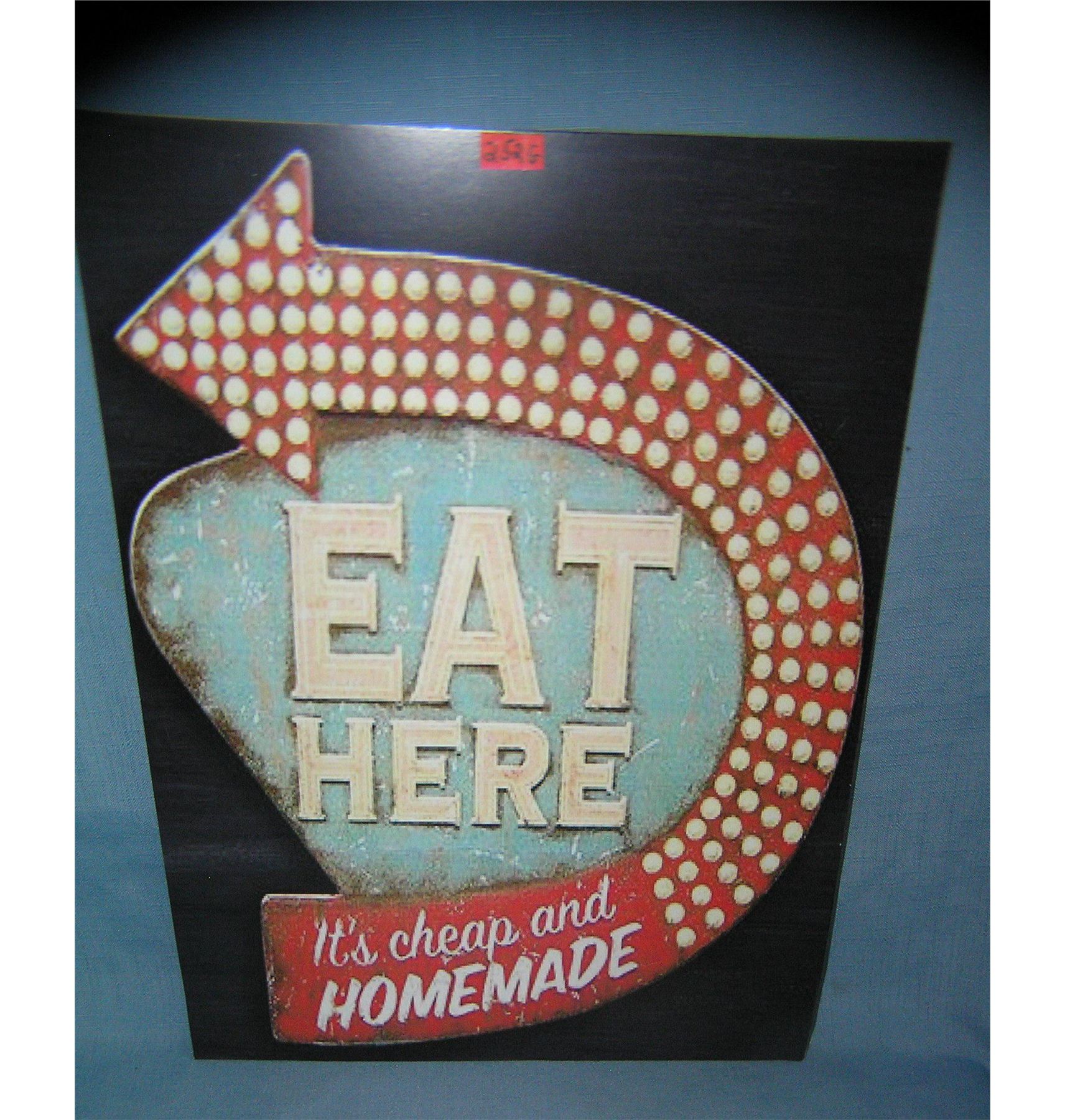 Eat Here it's cheap and homemade retro style advertising sign 12 inches by 16 inches on board est. value $40.00-$50.00