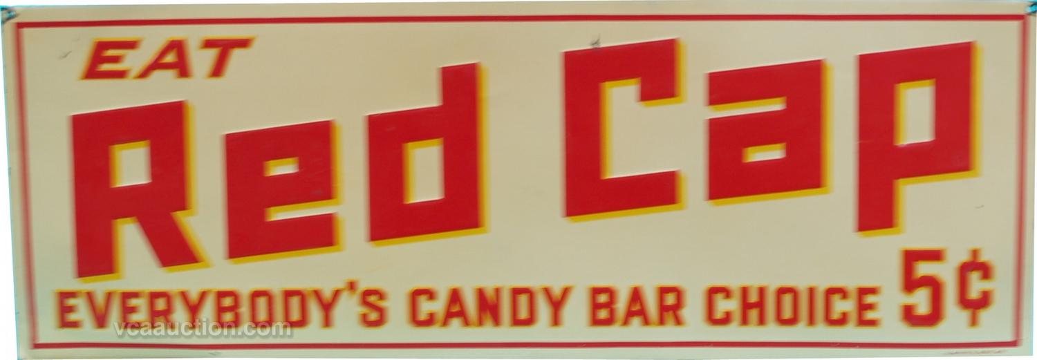 Eat Red Cap Embossed Tin Sign "Everybody's Candy Bar Choice 5 Cent" - 28" x 10"