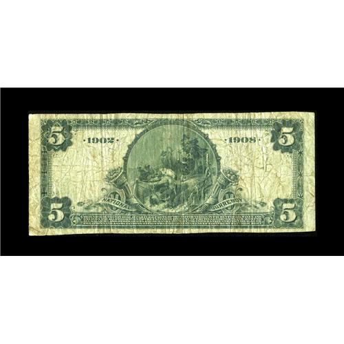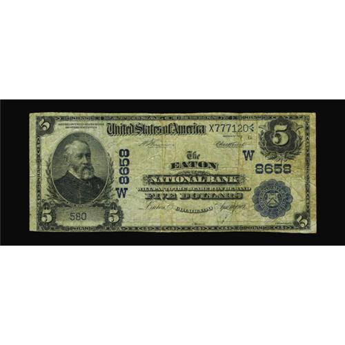 <B>Eaton, CO</B></I> - $5 1902 Date Back Fr. 592 <B>The Eaton NB</B></I> Ch. # (W)8658<BR>This Colorado trophy note is newly discovered and offered here to the collecting fraternity for the first time. It comes from an obscure issuer which issued virtually nothing after 1916 and likely redeemed its circulation early, leaving just $970 outstanding when the bank closed for good in 1931. This example is unique to our best knowledge, with no examples from here having been listed in any census and no offerings of any kind recorded. With every Colorado collector lacking this charter, expect some fireworks before the bidding is concluded for this lot tonight. <B>Fine.</B></I>