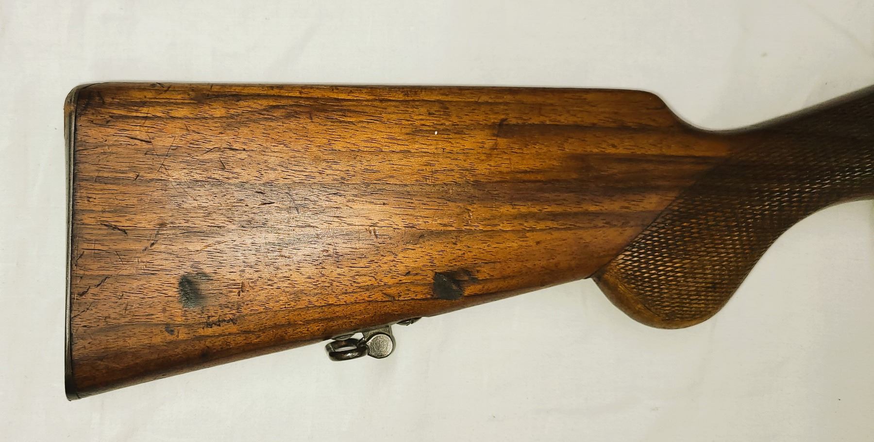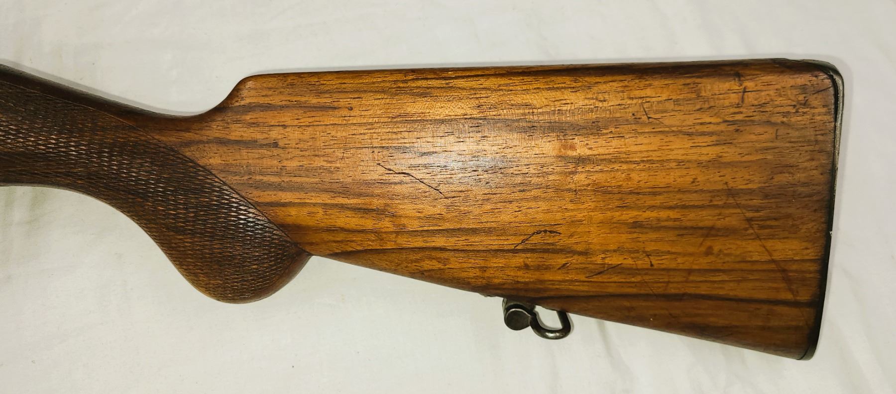 One piece sporter wood stock, pistol grip checkered behind receiver,