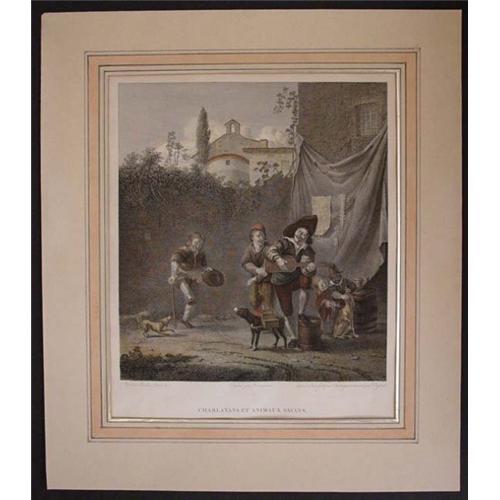 Color eau forte engraving entitled "Charlatans et animaux savants" (Quacks and Performing Animals). It depicts a genre scene of a travelling show of musicians, midgets and performing animals and is designed by Dessene. Alexandre Joseph Dessene, (1785-1827) was a French School artist known for his genre scenes and illustration of French classics. His work is part of the collection of the San Francisco Museums of Art. Made after the painting by the same name by Karl Le Jardin (1621-1678), a 17th Century Dutch printmaker and painter.