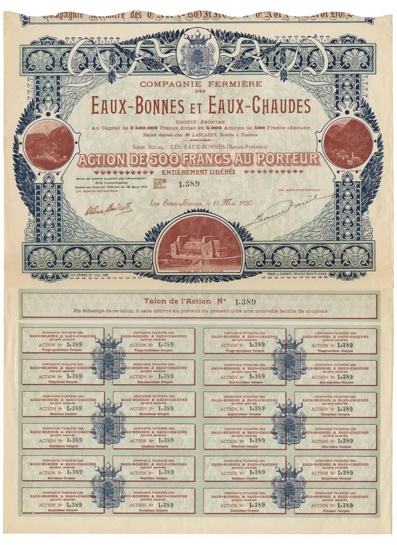 1920, France. Stock certificate for 500 francs. Three vignettes of the mountainside scenery surrounding the casino’s location including the building itself. Coupons at bottom. Uncancelled and fold at center extremely fine