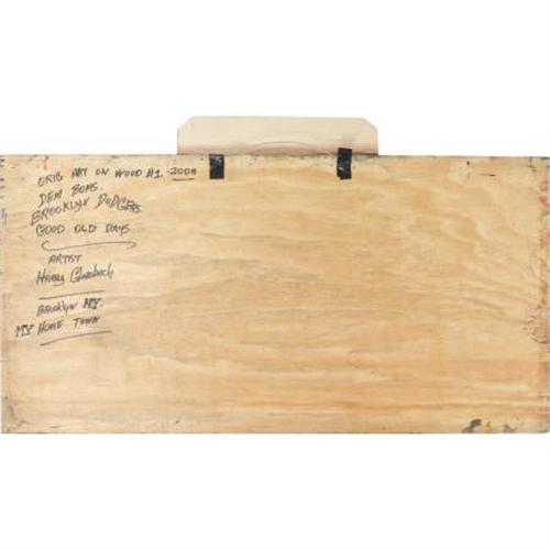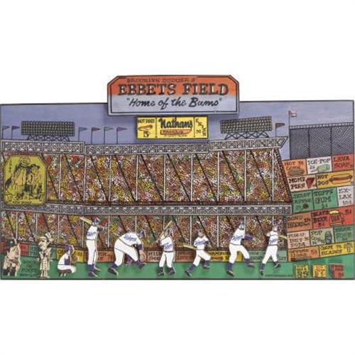 <B>"Ebbets Field" Original Artwork by Glaubach.</B></I> Celebrated Big Apple folk artist Harry Glaubach's unmistakable style is put to wonderful effect with this piece recalling the beloved Flatbush ballpark and the legendary players who once called it home. Commissioned works from this witness to decades of New York baseball history reside in the personal collections of such notable figures as James Cagney, Darryl Strawberry and Lou Piniella. A line-up of white uniformed Dodgers join Abbott and Costello and the Brooklyn Bum in the foreground, with a packed grandstand and charming early advertising signs dominating the rear. Constructed from die-cut wood and painstakingly applied paint, this large and impressive three-dimensional work measures 26x48x5". One of two original works by Glaubach presented within this auction, each signed by the artist on verso. <BR><BR><b>Shipping:</b> Flat Material, Large (<a target="_blank" href="http://www.heritageauctions.com/common/shipping.php">view shipping information</a>)