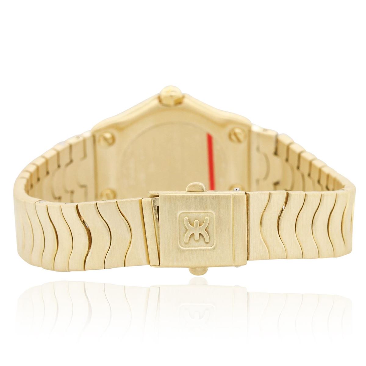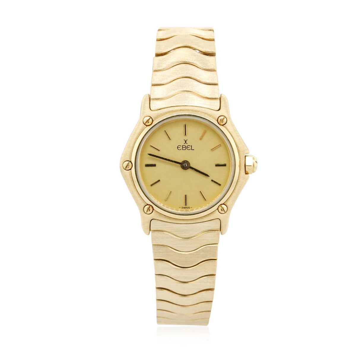 One ladies Ebel wristwatch featuring: 18KT Yellow Gold dial, case, crown, bracelet five screw bezel, gold dial with analog display, Ebel logo at 12 o'clock position, hour markers, black hour and minute hands Swiss movement, jeweler's clasp. Watch weighs a total of 52.90 grams.