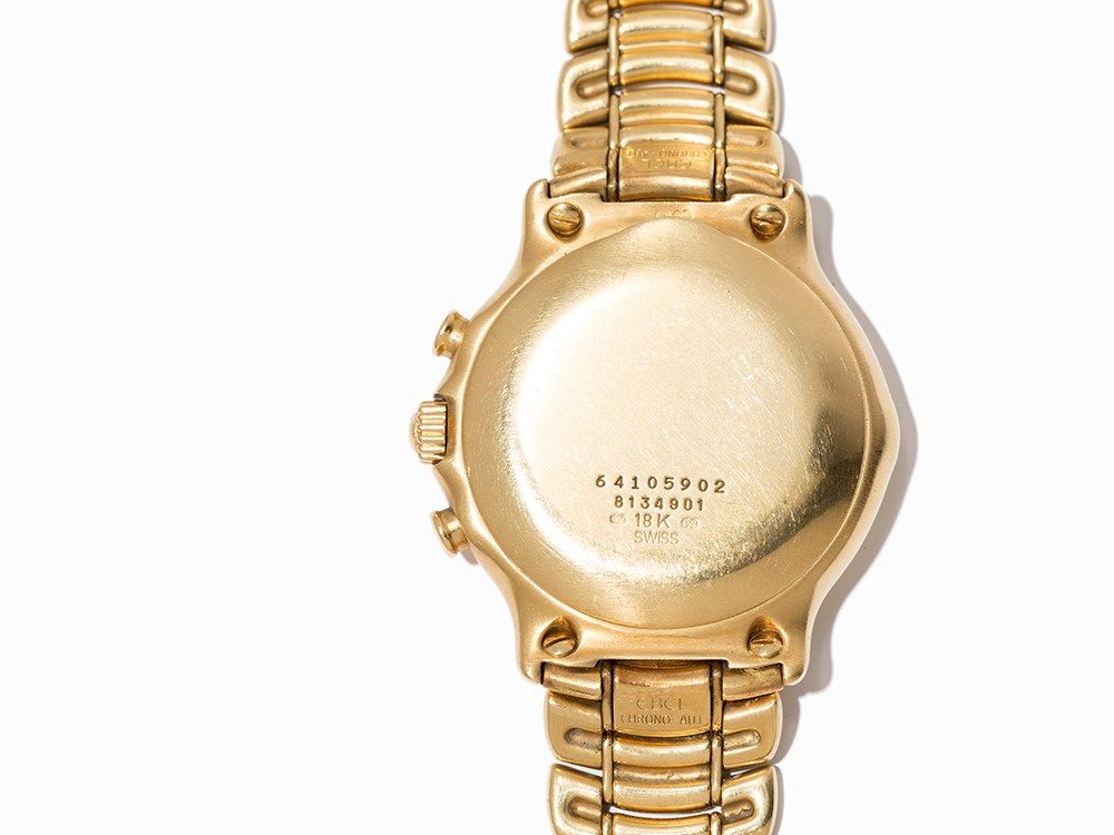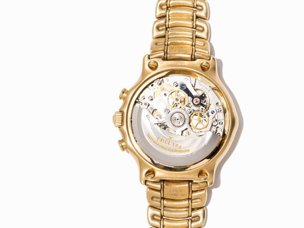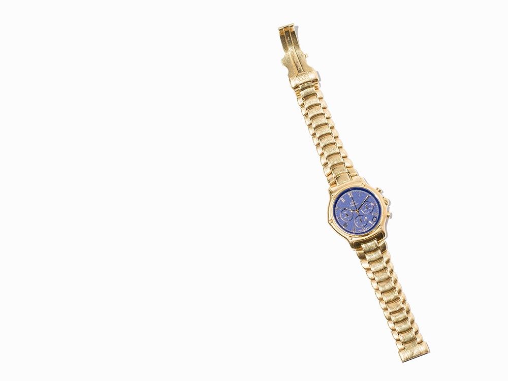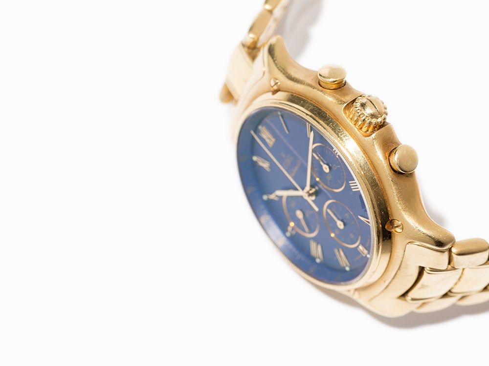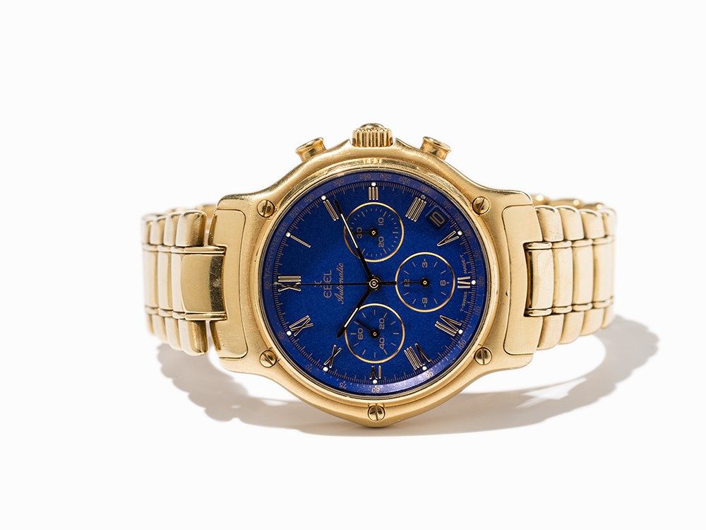 This Ebel chronograph was made in Switzerland around 1995. The watch is fitted with an automatic movement calibre 134 with 31 jewels and displays hour, minute, second, date and chronograph. The blue dial shows gold hands. The watch case, strap and folding clasp are made of 18K gold. The watch case number is 8134001. The watch case and folding clasp are hallmarked.