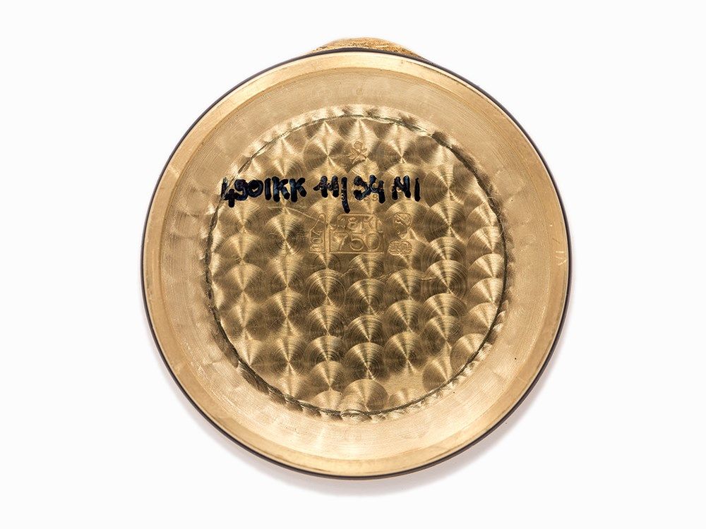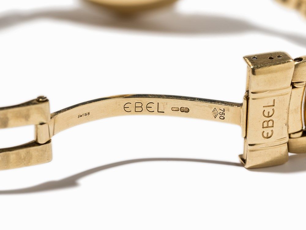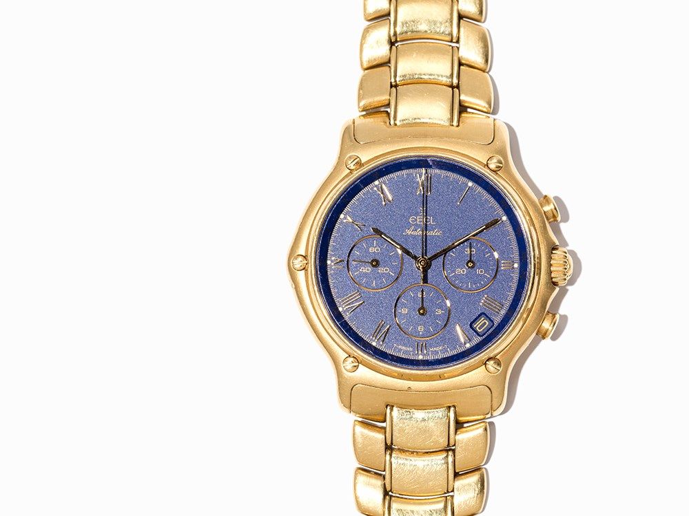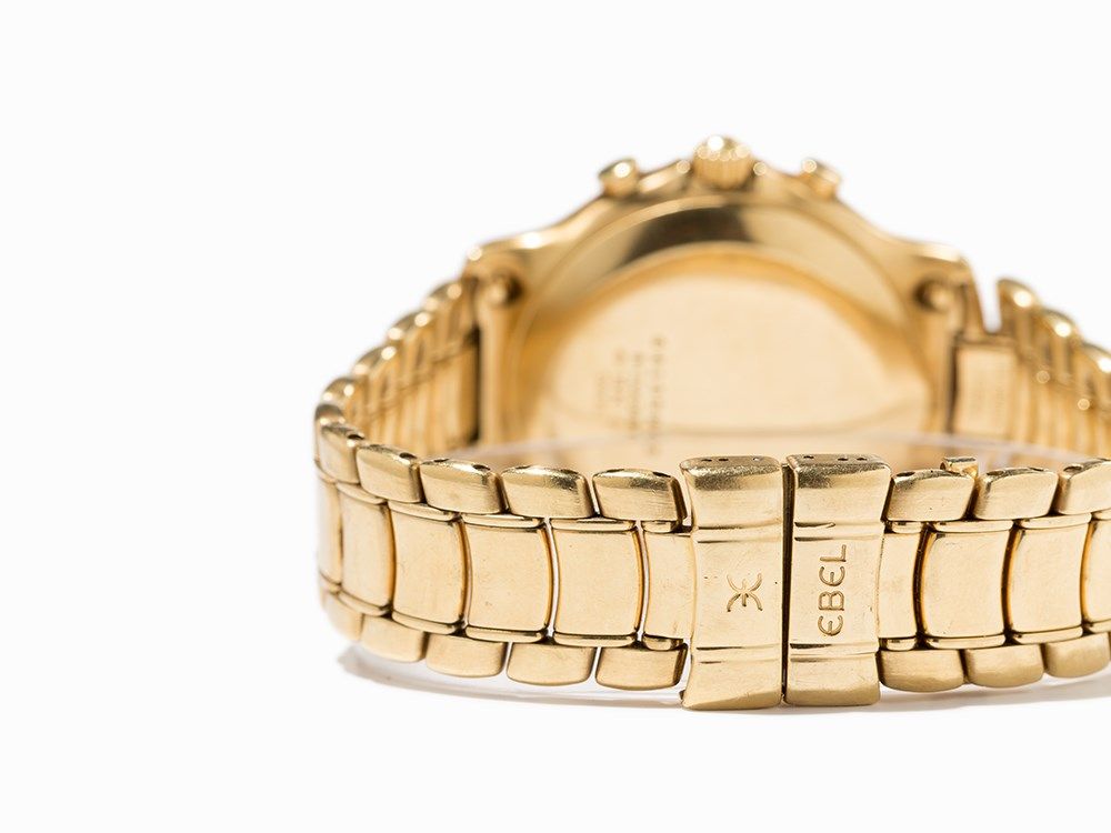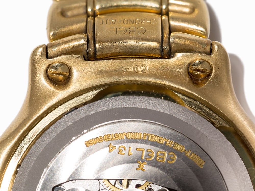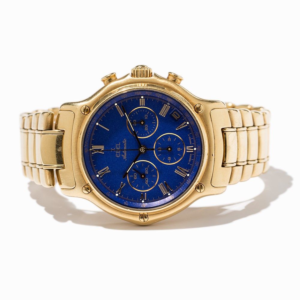 This Ebel chronograph was made in Switzerland around 1995. The watch is fitted with an automatic movement calibre 134 with 31 jewels and displays hour, minute, second, date and chronograph. The blue dial shows gold hands. The watch case, strap and folding clasp are made of 18K gold. The watch case number is 8134001. The watch case and folding clasp are hallmarked.