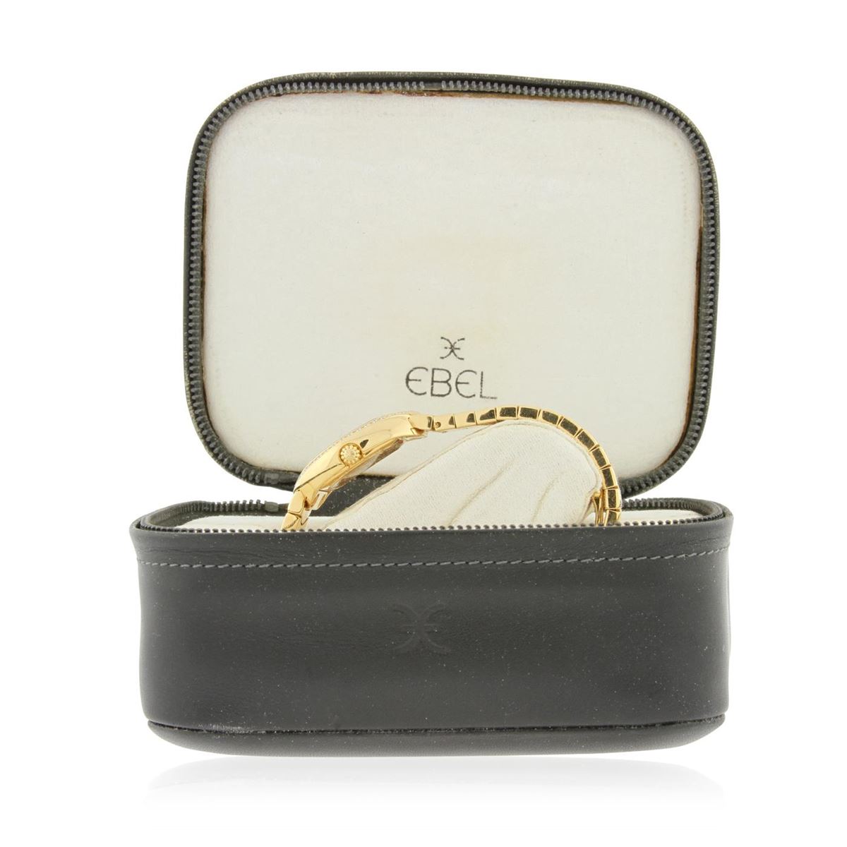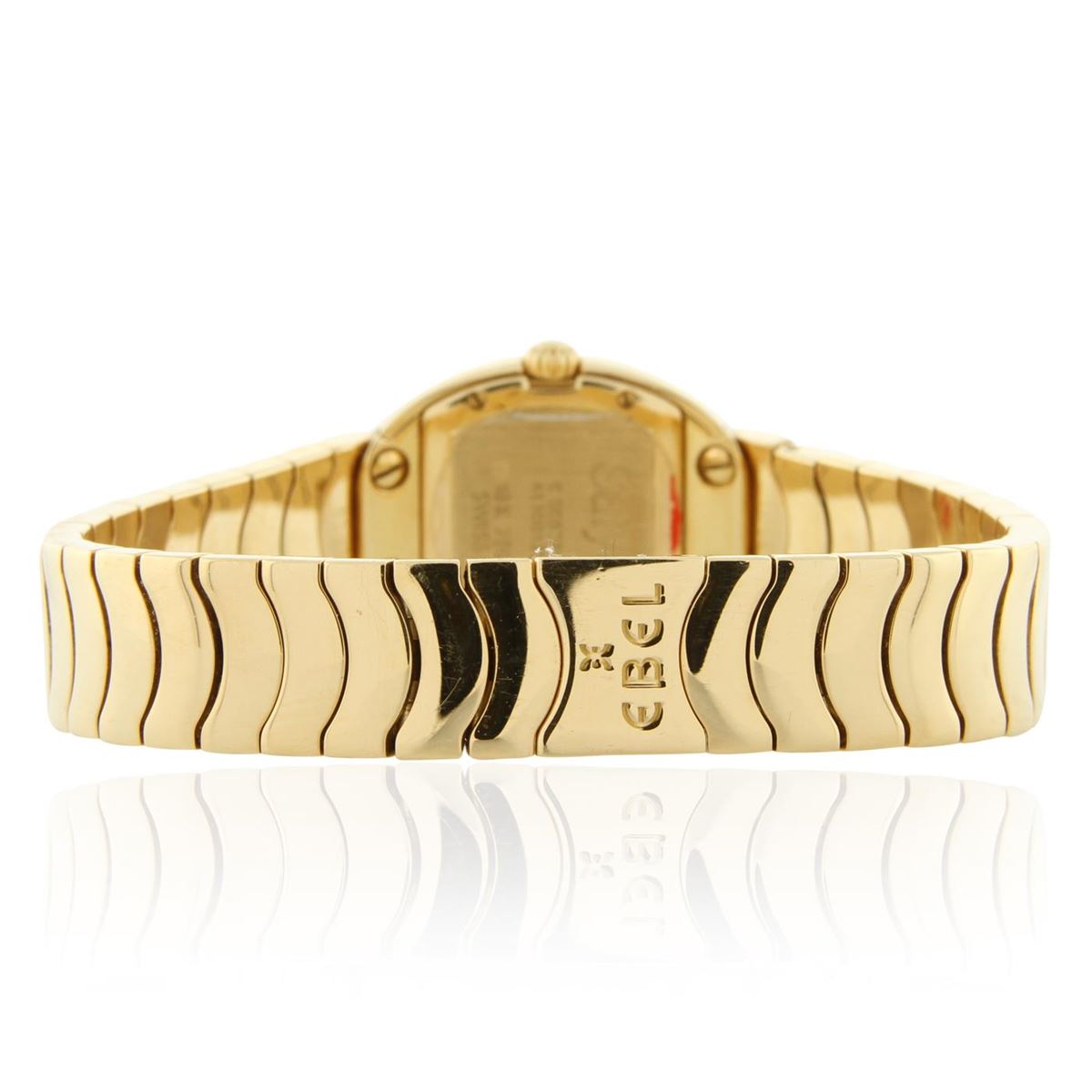 One Ebel Satya Yellow Gold Diamond Wristwatch featuring: White mother of pearl Diamond Dial & Bezel, 18KT Yellow Gold Case 22.5mm wide, 29mm long, 8mm thick, Back Screw-In Closed Case, 18KT Yellow Gold Bracelet 12 mm wide, with Type Fold-Over Clasp, fitting wrist sizes up to 7.5 inches, Pull and Push Fluted Crown, Gold Tone Hand Indicators, 12 Diamond Hour Markers, Scratch-Resistant Sapphire Crystal, Battery Powered Swiss Quartz Movement. Water Resistant to 30 m / 100 ft.