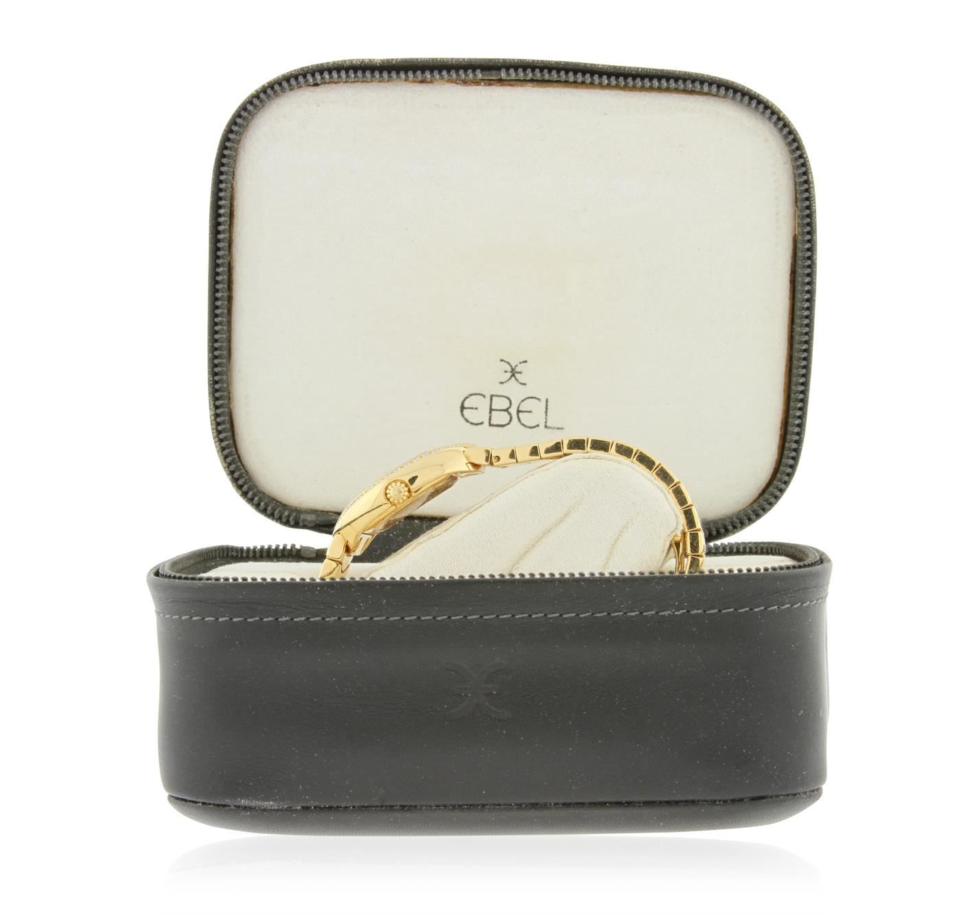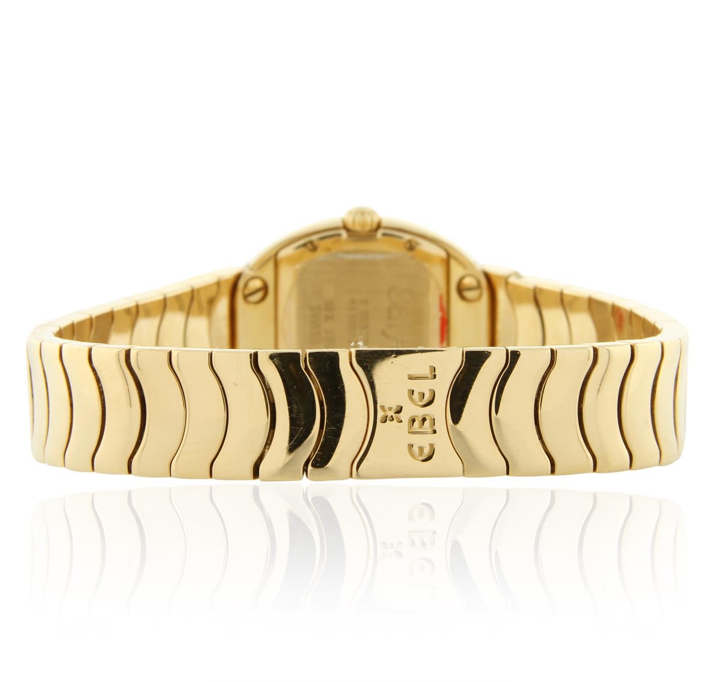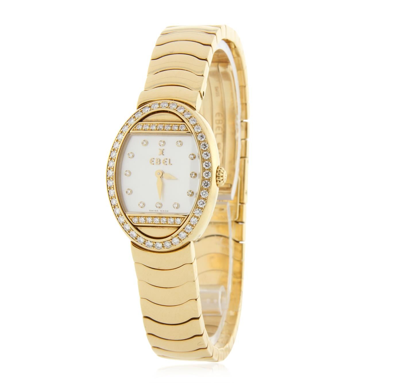 One Ebel Satya Yellow Gold Diamond Wristwatch featuring: White mother of pearl Diamond Dial & Bezel, 18KT Yellow Gold Case 22.5mm wide, 29mm long, 8mm thick, Back Screw-In Closed Case, 18KT Yellow Gold Bracelet 12 mm wide, with Type Fold-Over Clasp, fitting wrist sizes up to 7.5 inches, Pull and Push Fluted Crown, Gold Tone Hand Indicators, 12 Diamond Hour Markers, Scratch-Resistant Sapphire Crystal, Battery Powered Swiss Quartz Movement. Water Resistant to 30 m / 100 ft.