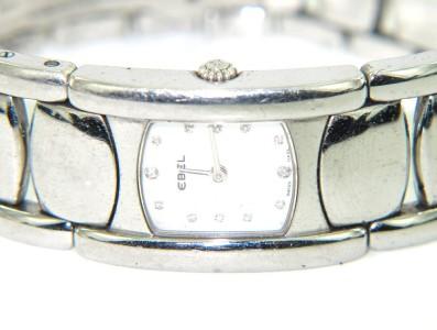 Ebel Stainless Steel Diamond Watch.The total watch's weight is 78.8 grams.The total diamond weight: 0.14 cts. H color, VS clarity.The measurements of watch head is 14 x 18 mm and 5 mm thick.The length of watch: 7".water Resistant.swiss made.Chain is 18 mm wide