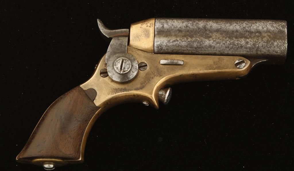 Early 4 barrel fifth model pepperbox pistol circa late 1860's with 2-3/4" barrels. Brass frame, square butt walnut grips, button trigger, fixed sights and side mounted hammer. Barrels tip up for loading and firing pin rotates for each barrel. Side plate marked "Starrs Pats May 10, 1864". Good markings and good working action. Condition: Good overall showing light pitting throughout on barrels and grips are very good showing light wear. *Antique Firearm*