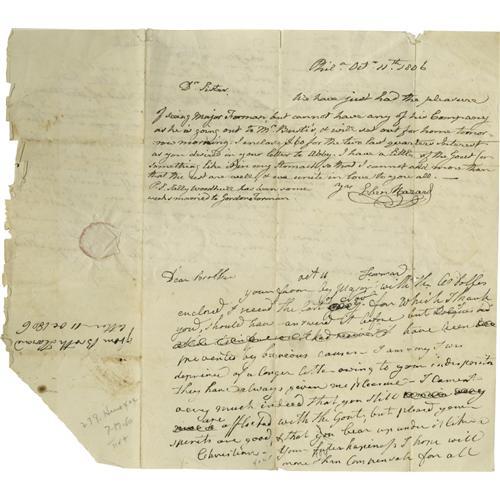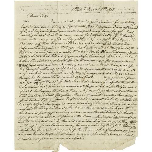 <B>Ebenezer Hazard Three Autograph Letters Signed</B></I> "<I>Eben Hazard</B></I>" (with added paraphs) to his sister, Elizabeth Breese. The first letter: one page to his sister plus one page reply on same lettersheet, 7.75" x 9.75", Philadelphia, October 11, 1806. In part, "<I>...I Have a little of the Gout (or something like it) in my stomach, so that I cannot add more than that the rest are well...</B></I>" The second letter: 2.5 pages, 8" x 9.5", Philadelphia, June 8, 1807. Third letter: one page, 8" x 9.5", Philadelphia, March 26, 1813. Hazard was the first postmaster of New York City and later, the Postmaster General under the Continental government. Under his guidance, the mail was first carried in stagecoaches, an improvement over the horse and rider system. Letters are generally in good to very good condition. From the Henry E. Luhrs Collection. Accompanied by LOA from PSA/DNA.