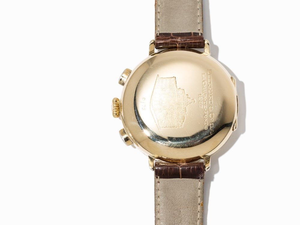 This Eberhard chronograph, ref. 31008, was made in Switzerland around 1985. The watch is fitted with a manual wind movement calibre 310-8 with 21 jewels and displays hour, minute, second and chronograph. The white enamel dial shows blued hands. The watch case is made of gold plated 925 silver. The watch has a brown leather strap with gold plated pin buckle. The watch case cover is hallmarked and has an initial engraving.