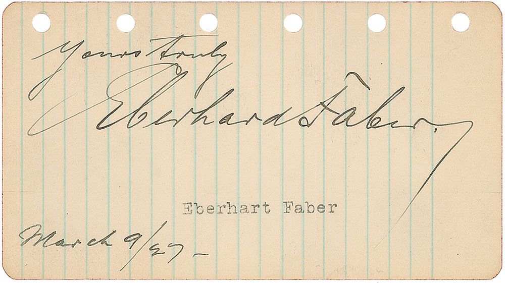Pencil magnate (1859–1946) who expanded the global presence of his family’s art supplies business. Vintage fountain pen signature, “Yours truly, Eberhard Faber, March 9/27,” on an off-white 4.5 x 2.5 lined page. In fine condition.