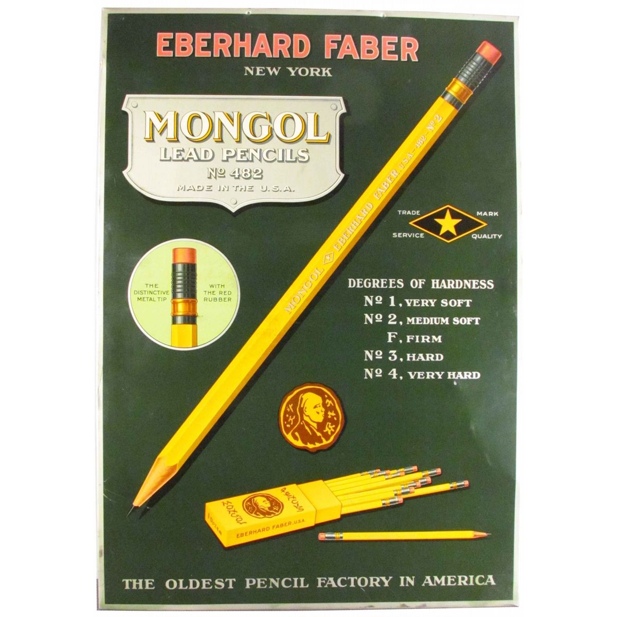 Eberhard Faber Tin Over Cardboard Sign. Advertising Mongol Lead Pencils. A small crease at 4:00 otherwise near mint condition. 19 X 27 inches.