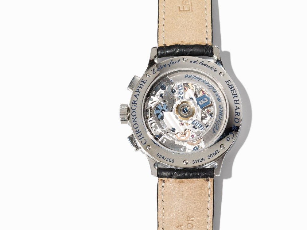 This Eberhard jubilee chronograph, ref. 31125, was made in Switzerland in 2012. The watch is limited, no. 054/500 and is fitted with an automatic movement calibre ETA 7750 with 28 jewels and displays hour, minute, second, chronograph and panorama date. The silver dial shows silver hands. Watch case and original folding clasp are made of stainless steel. The watch has an original, black leather strap and a sapphire glass bottom. The serial number is 31125CPD.