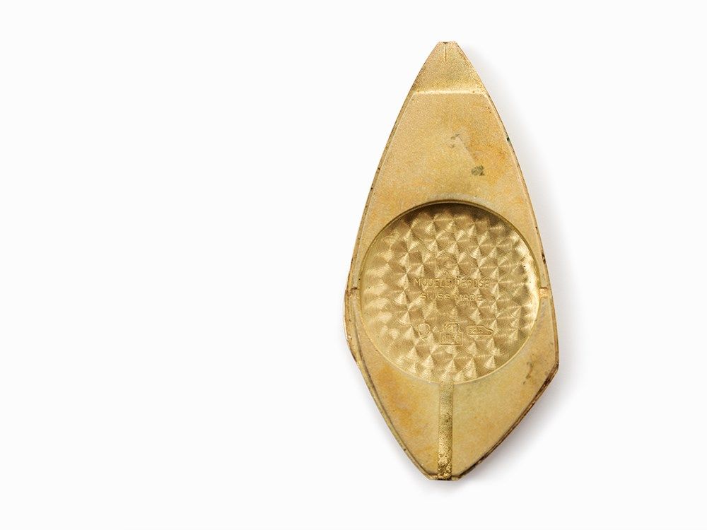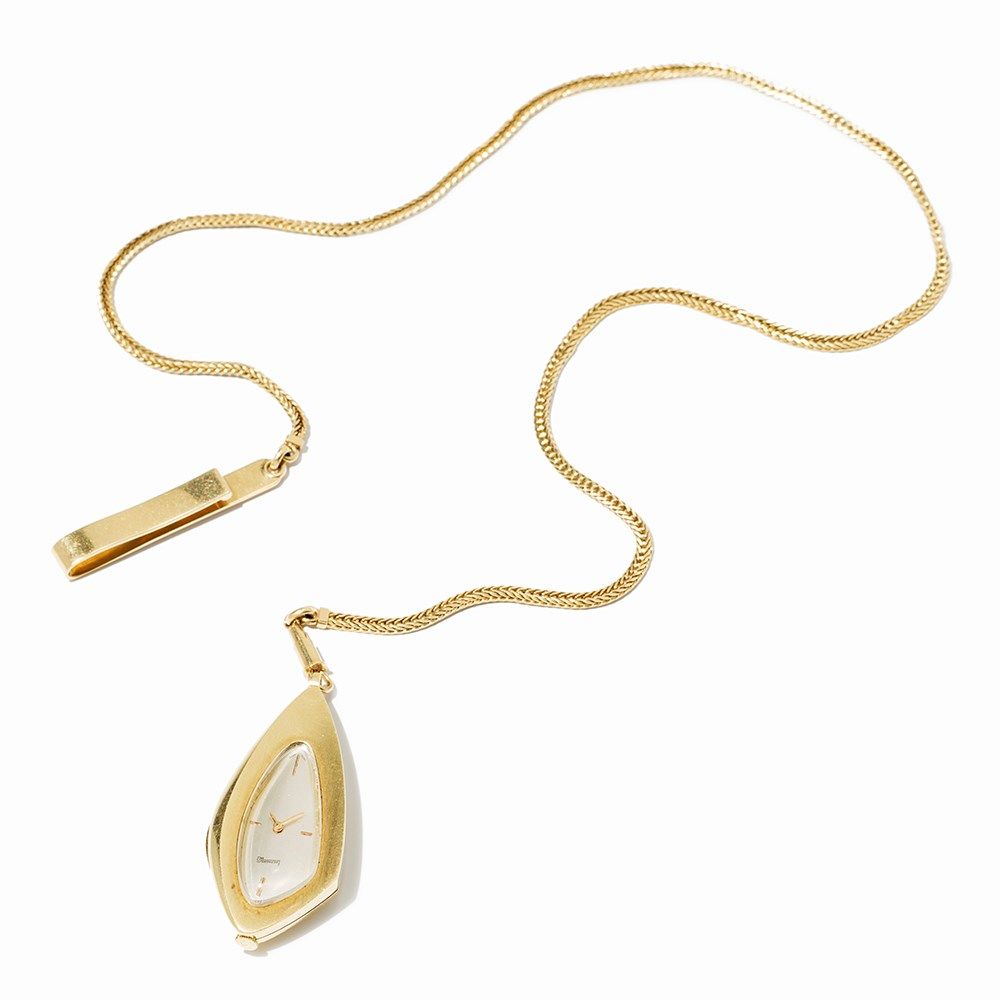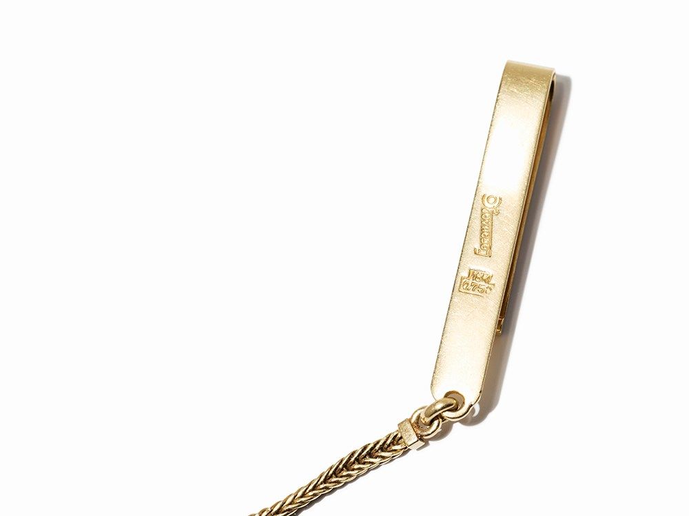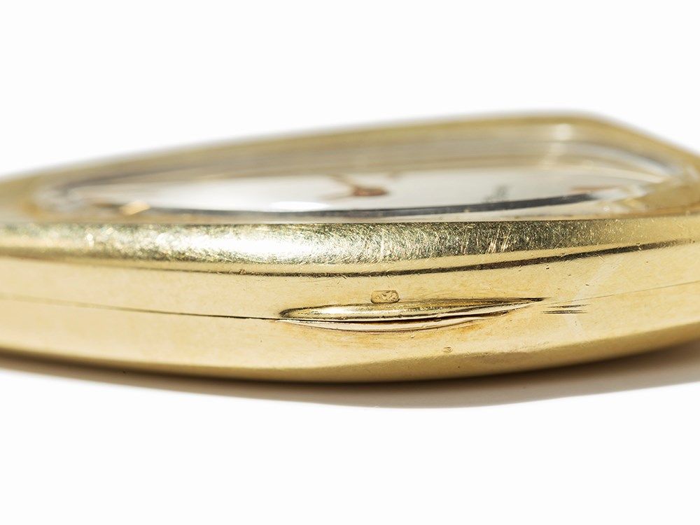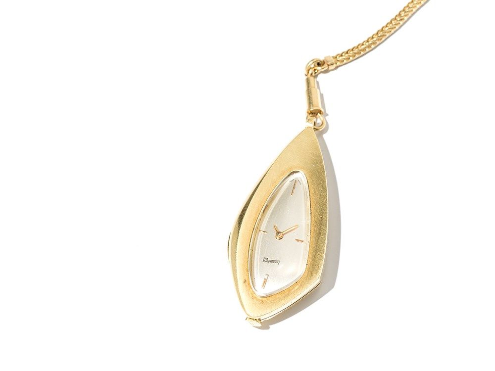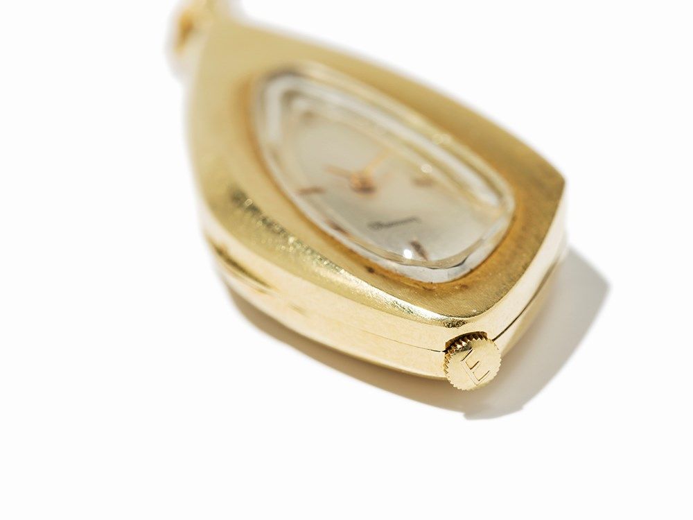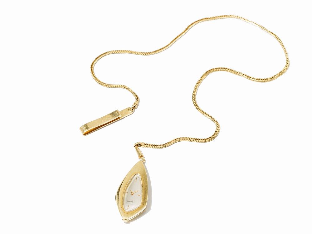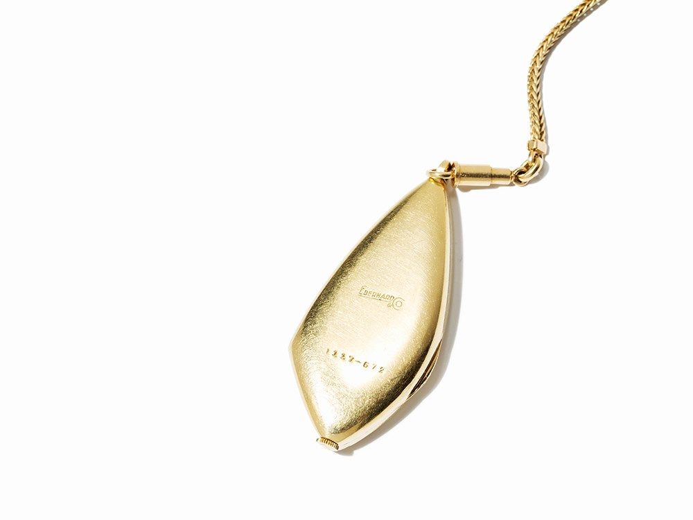 This Eberhard women’s pocket watch with chain was made in Switzerland around 1970. The watch is fitted with a manual wind movement calibre Eberhard 879 with 17 jewels and displays hour and minute. The silver dial shows gold hands. Watch case and chain are made of 18K gold. The watch case number is 1117-672. Watch case cover and chain are hallmarked.