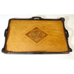 Ebonised and Sorrentoware tray inlaid with parrots on a branch, 60cm in length