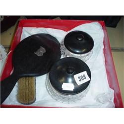Ebonised dressing table set including mirror and toilet jars