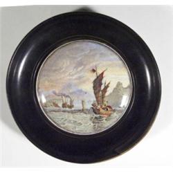 Ebonised framed Victorian Prattware pot lid 'Ning Po River', 11cm diameter
