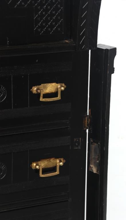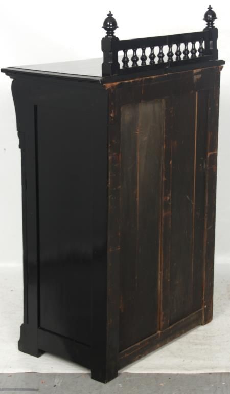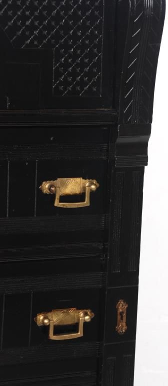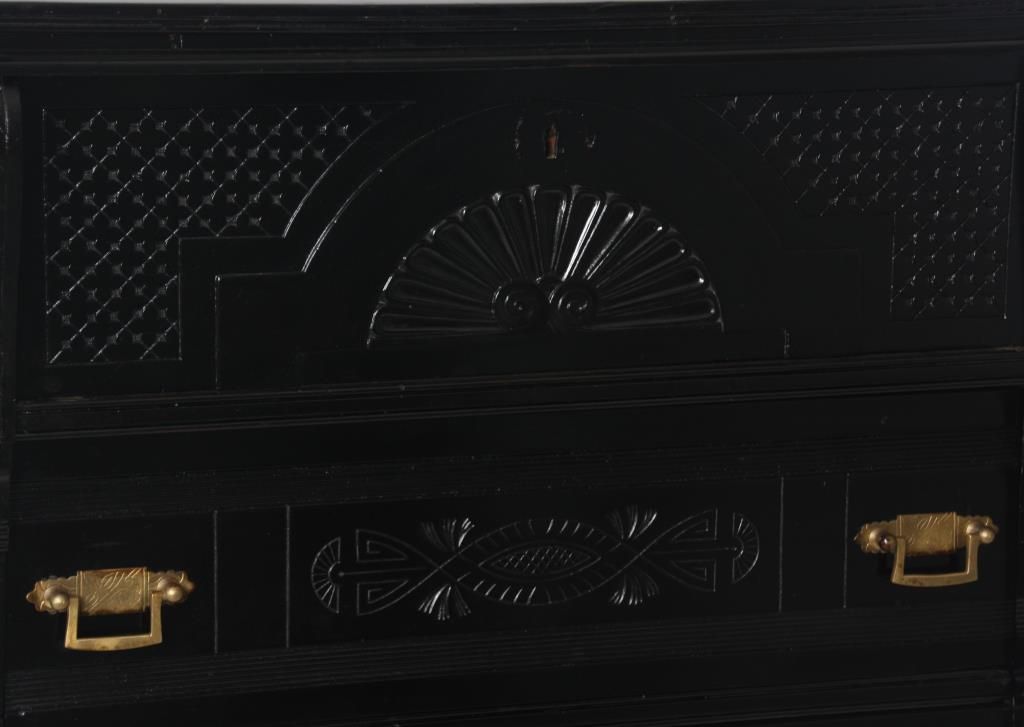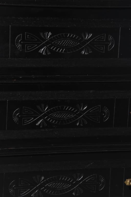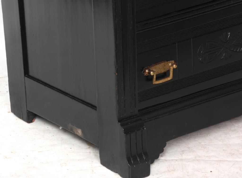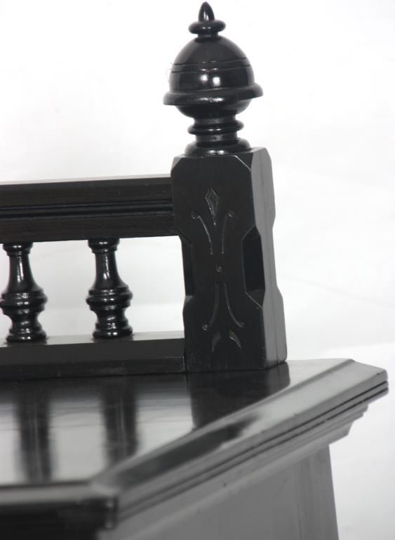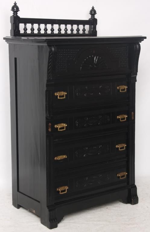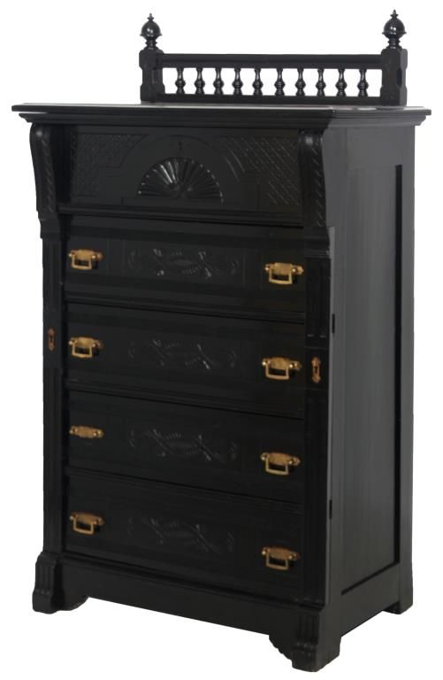 Ebonized 5 Drawer Lockside Chest. Spindled backsplash with large turned inverted acorn finials; overhanging top with corbels over pilasters, has a large top drawer and the 4 lower drawers have brass pulls, carved fronts and a hinged locking side pilaster. One handle is missing, ebony refinish, gallery top is incomplete. 54 in. high x 32 in. wide x 19 in. deep.