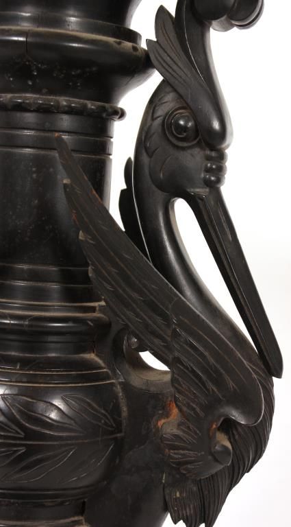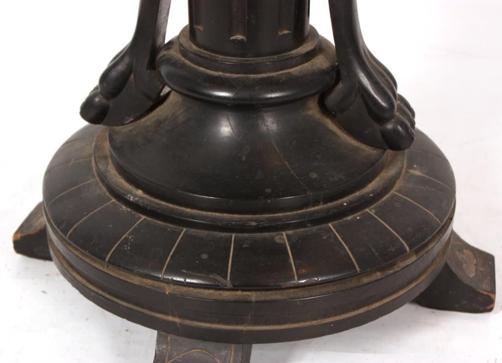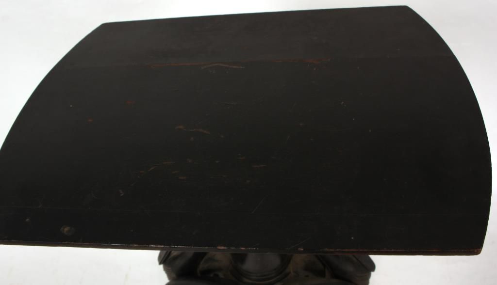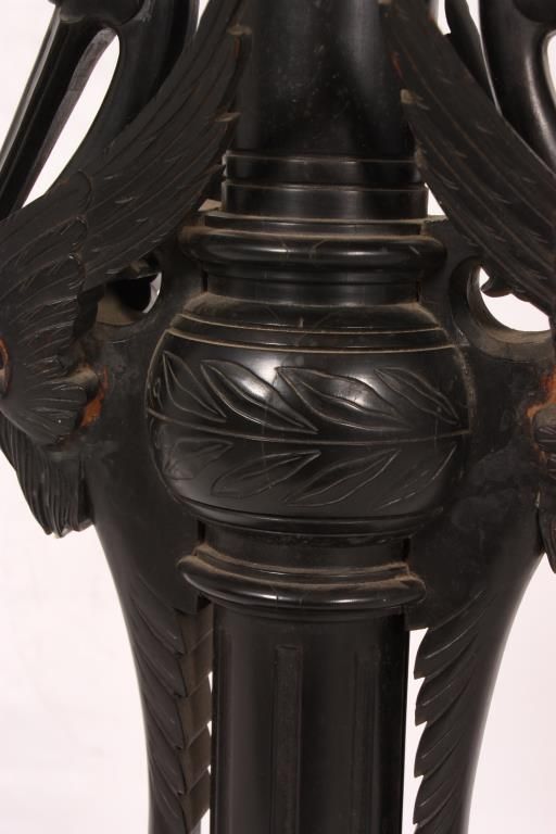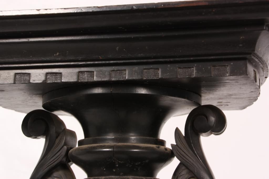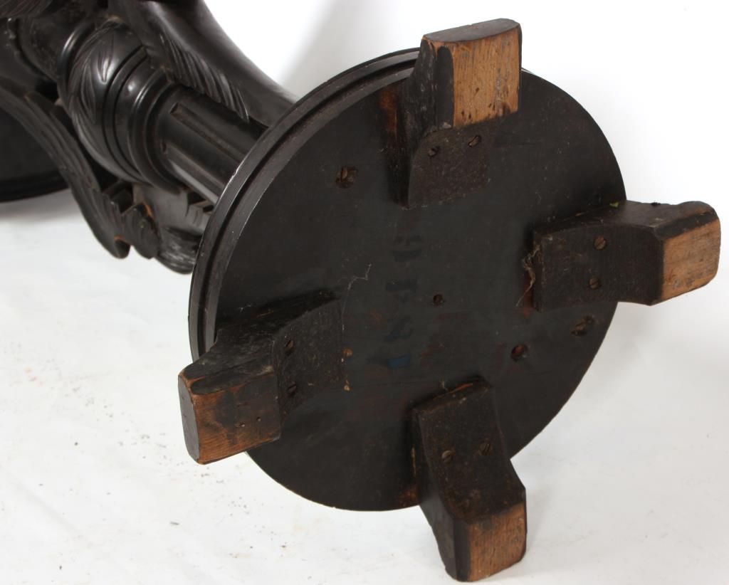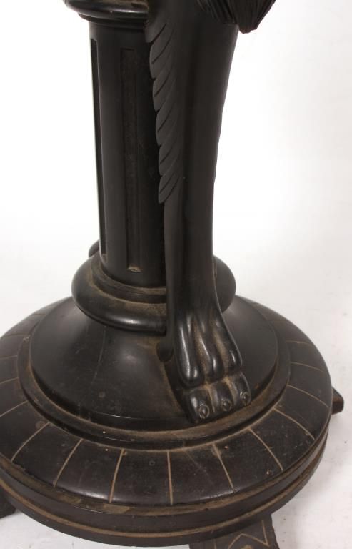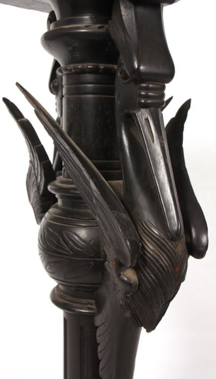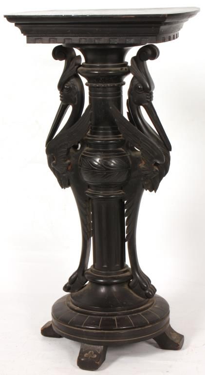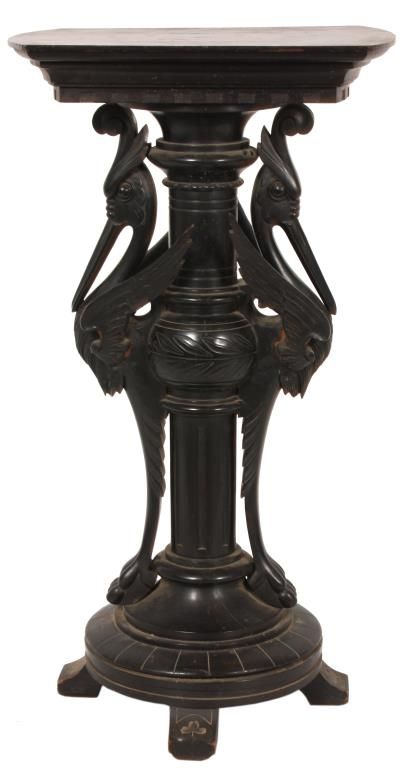Ebonized Figural Carved Renaissance Pedestal. Rectangular top with rounded sides over a turned center column and full standing figural stork supports over a round platform base and 4 square convex feet with incised leaf carvings. Original ebony finish in good condition. 37.5 x 20.5 x 14.5
