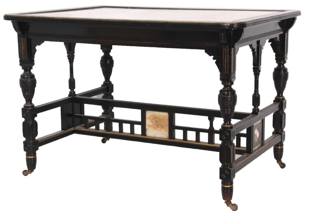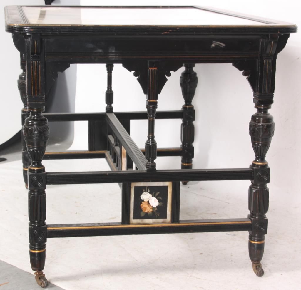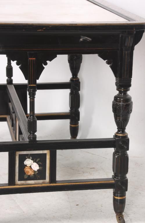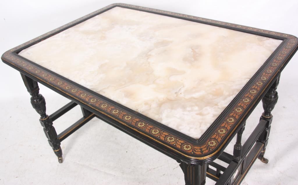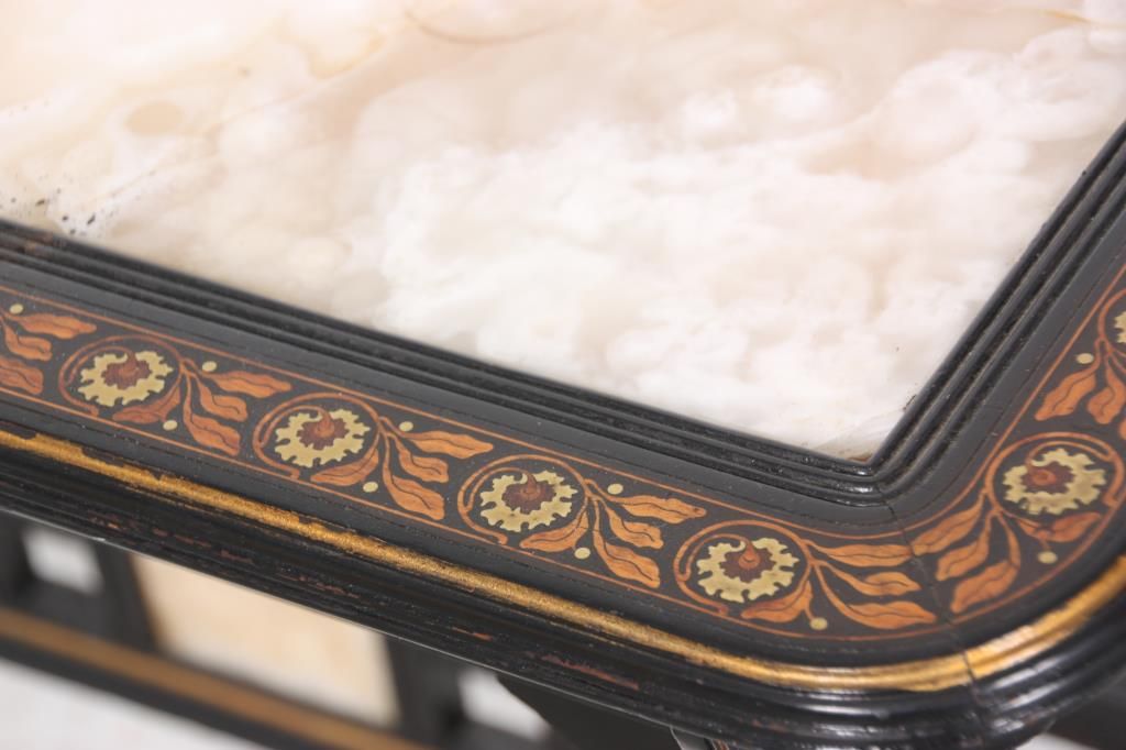 Ebonized & Inlaid Onyx Top Table. Beautiful white onyx top is inset in brass and wood inlaid floral and filigree border, stands on square form legs with reeded highlights and leaf carved inverted teardrop turnings in the middle; the side stretchers and center stretcher have square inset floral onyx and marble pietra dura panels. Table has a nice overall ebonized finish with some gilt highlights; in good general condition, pietra dura panels are in good condition, repair top onyx top and repair to one foot. 30 in. high x 44 in. wide x 32 in. deep.