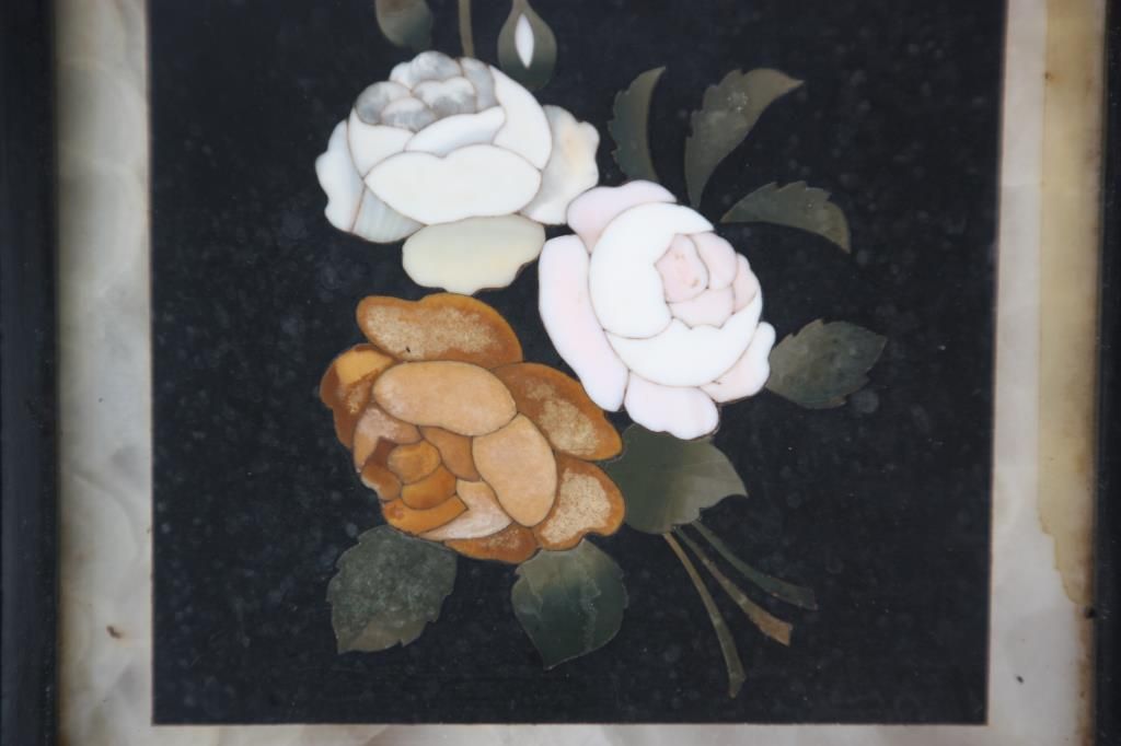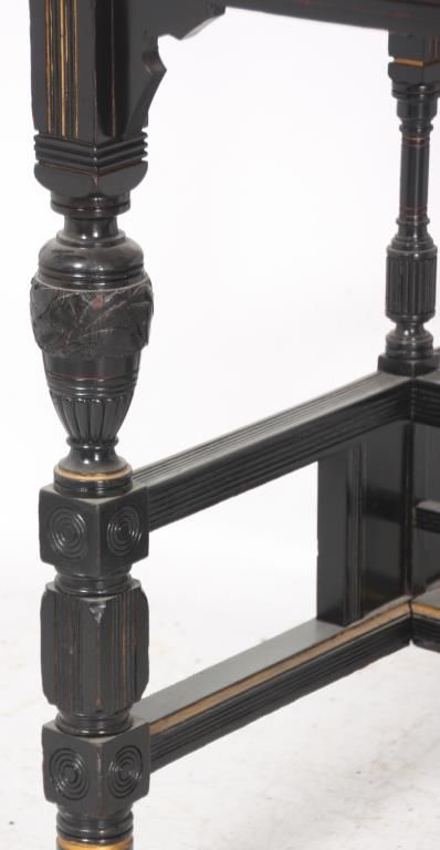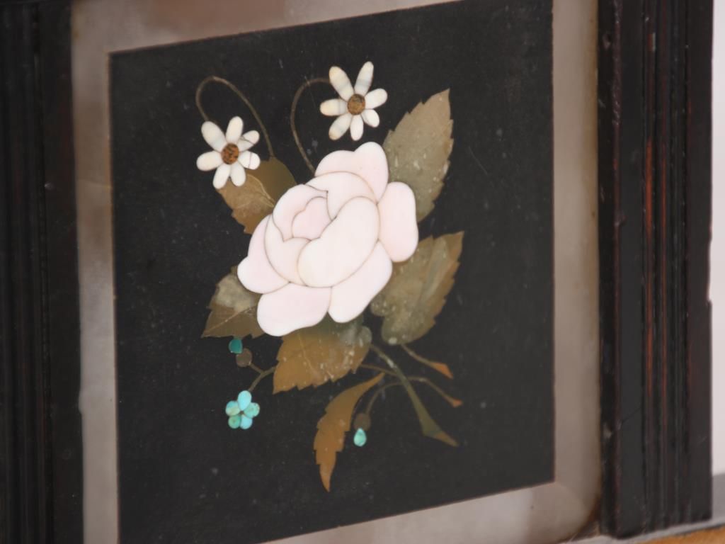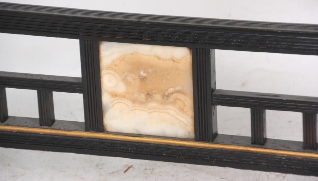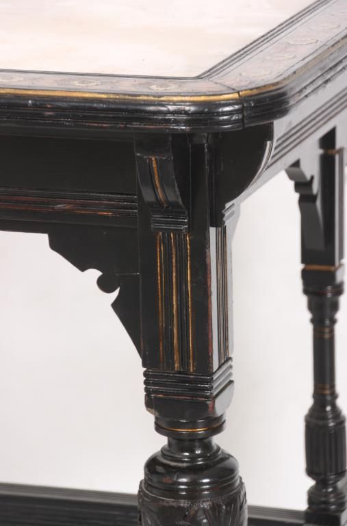 Ebonized & Inlaid Onyx Top Table. Beautiful white onyx top is inset in brass and wood inlaid floral and filigree border, stands on square form legs with reeded highlights and leaf carved inverted teardrop turnings in the middle; the side stretchers and center stretcher have square inset floral onyx and marble pietra dura panels. Table has a nice overall ebonized finish with some gilt highlights; in good general condition, pietra dura panels are in good condition, repair top onyx top and repair to one foot. 30 in. high x 44 in. wide x 32 in. deep.