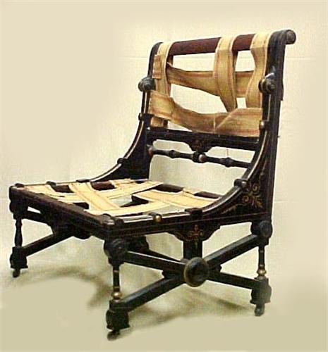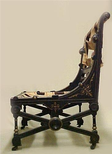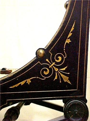 Ebonized Victorian settee; gilding over incised design; turned stretcher base measures 34" high x 33" across x 24" deep; mid to late 19th C. (normal wear)WILL NOT SHIP.