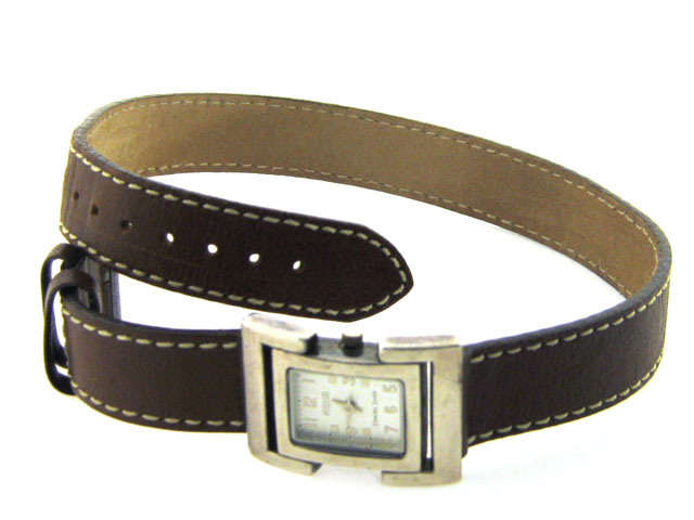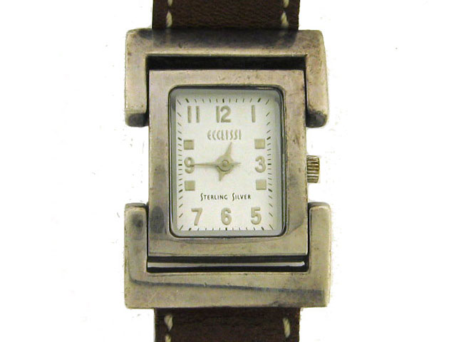 This is a Rectangular Leather Strap Watch by Ecclissi with the following features: sterling silver case; Japan quartz movement; Stainless steel back, Water resistant; Leather strap with measurement of approximately 11-1/2 inches long X 5/16 inches wide.