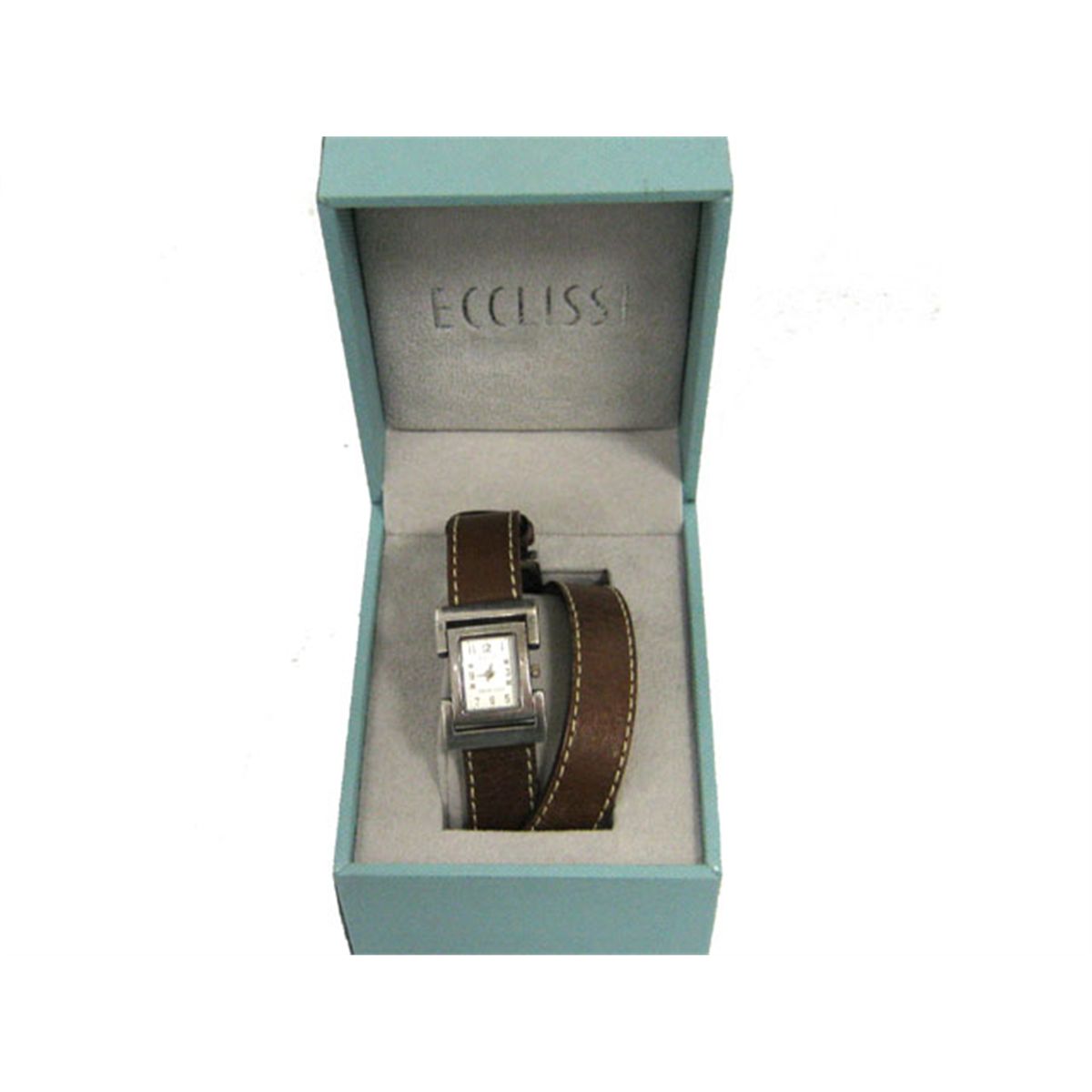 This is a Rectangular Leather Strap Watch by Ecclissi with the following features: sterling silver case; Japan quartz movement; Stainless steel back, Water resistant; Leather strap with measurement of approximately 11-1/2 inches long X 5/16 inches wide.