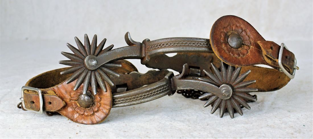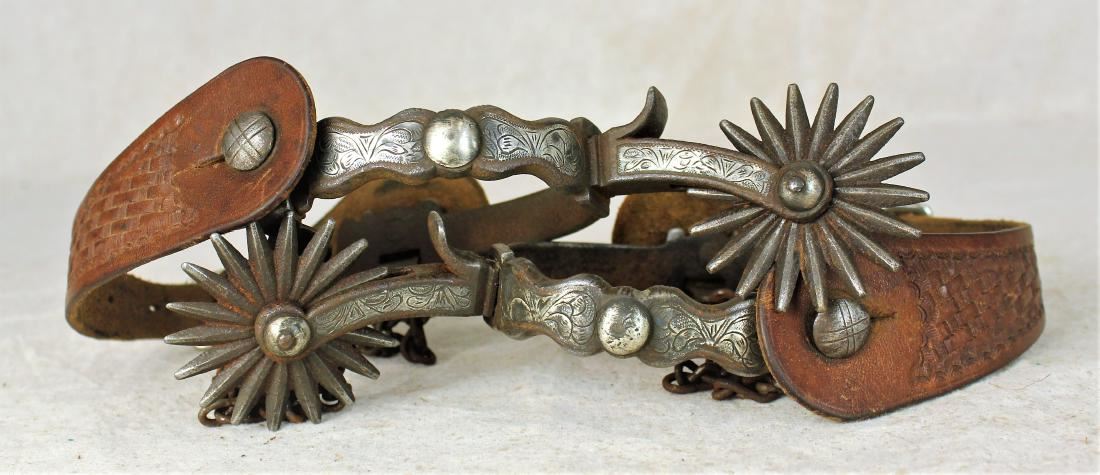Early single mounted California's, with beautifully engraved inlaid silver, deeply chased off sides and strap buttons, and fantastic multi-point rowels. Complimented by a nice pair of straps. Unmarked but with all the characteristics of Echavarria.