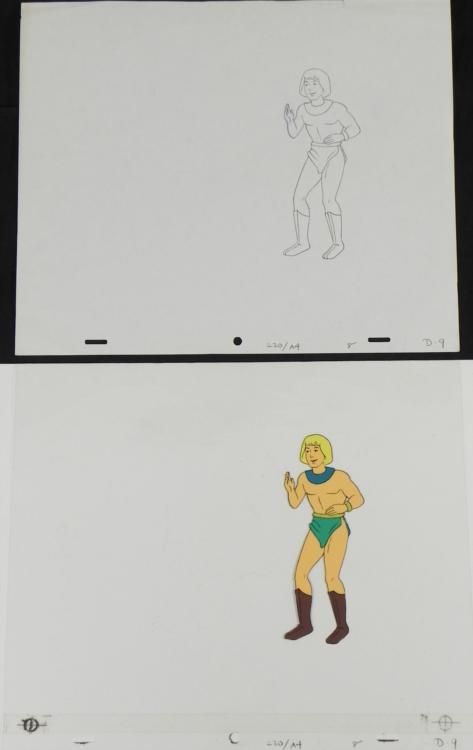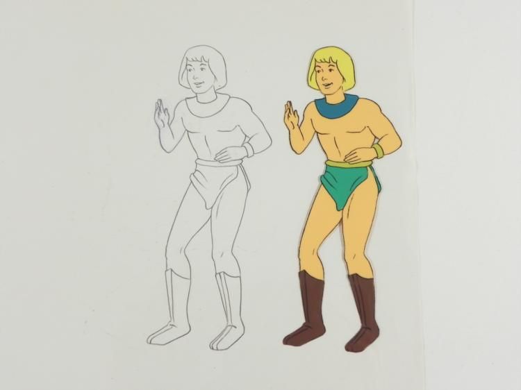 The Herculoids battled to defend their planet from menaces on * Amzot/Quasar and from outer space. All of the Herculoids displayed * Human-level intelligence - employing precision teamwork and complex * tactics - as well as emotions, and Zandor and Tara both * displayed a working knowledge of complex alien technologies as well as * the ability to pilot interstellar spacecraft—but essentially, Zandor, * Tara, Dorno, and the Herculoids were fighting to keep Amzot/Quasar a * technology-free, primitive planet. This is further * indicated by the pseudo-barbarian outfits of Zandor, Tara, and Dorno * and the fact that technology was used mainly by the various villains, * but rarely if ever by the heroes. Although the "speech" of their * companions was limited and repetitive, Zandor, Tara * and Dorno demonstrated that Gloop and Gleep, at least, had a * comprehensive mode of communication, and that they could at least * understand and interpret this language. * * * * **The cel and drawing are at least 35 years old. * * * * HEELLLLLOOOO!!! CAN ANYONE HEAR ME?!?!? * * <ul type="disc"> * Original Animation * and Drawing * * Original * "rough" animation drawing, in black and non-photo blue pencil with the * notations in black. * * * Overall * Size of Drawing: 10 1/2" x 12 1/2" * Overall * Size of the Cel: 10 1/2" x 12 1/2" * Excellent * condition * This is an original hand-painted cel set-up * used in the production of an episode of "Herculoids." Each one-of-a-kind * set-up represents a slight change in position of the characters. When * individually photographed and projected in rapid succession, * the images * appear to move. * * To create production cels, the original animator's drawing is * transferred onto an acetate cel (by hand-inking and/or photo copying). * The cel is then hand-painted on the reverse side. * * * The drawing and cel are ready to be matted and * framed. The notations are located at the bottom of * the drawing and cel. *