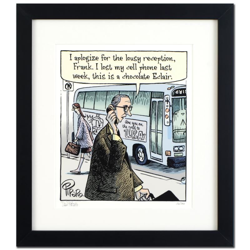 Enter a surreal and satirical world of twisted imagination and award winning creativity. "Eclair Cell Phone" is a limited edition giclee on paper by Dan Piraro, creator of the critically acclaimed and award winning comic strip, Bizarro! This piece is framed, numbered and hand signed by the artist! Includes Certificate of Authenticity! Measures approx. 17" x 19" (with frame), 9.5" x 11.5" (image).