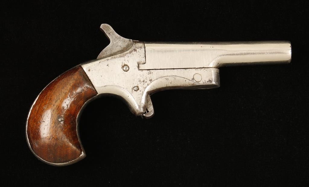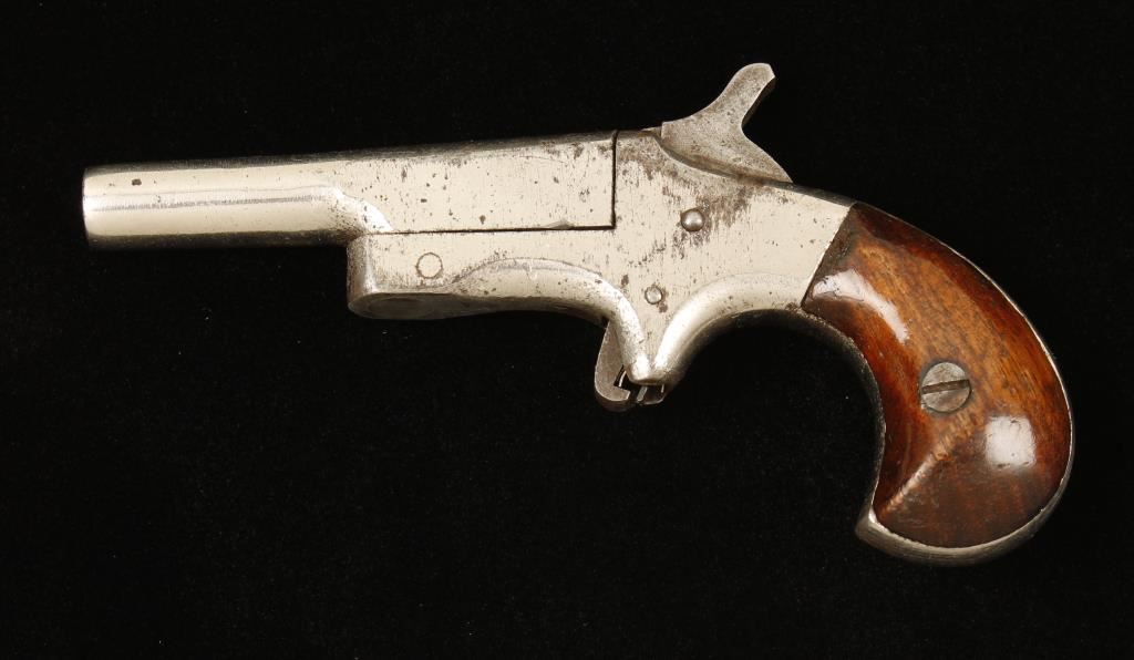 Made by Iver Johnson. Nickel plated single shot spur trigger side swing chamber pistol with a 2-1/2" barrel and wood grips. Over 70% of the plating remains. The bore has no rifling and shows areas of pitting. The action works. The wood grips have small dings and are losing their varnish. Condition is fair. *Antique Firearm*