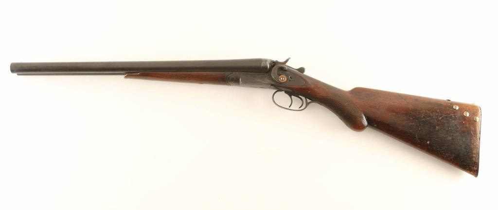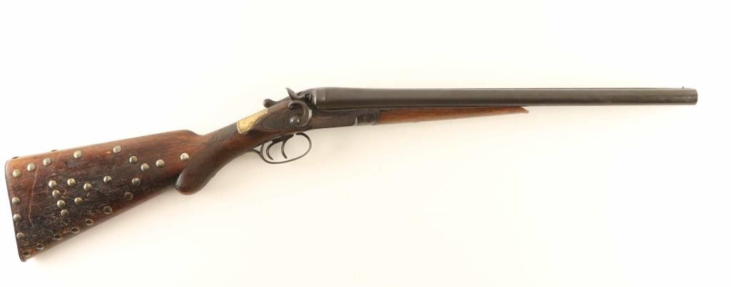 Shotgun, Double-barrel. "Coach Gun" Belgium made. Eclipse Gun Co. marked side-plates. 18 1/4" barrels. 34 1/2 " overall length. Break-top, side hammers. Double triggers. Top of barrels marked " No5212 Twist finish Belgium" About 20% black painted finish on metal. Stock has old repair to the right wrist area, with a brass plated tacked on. Brass tacks have been added to the right side of the stock. Bores are dark, dirty. Wood has numerous small scratches /dings. left hammer was a replacement screw, washer added. Operable. Barrels lock up tight. NRA Condition-Fair. Antique firearm.