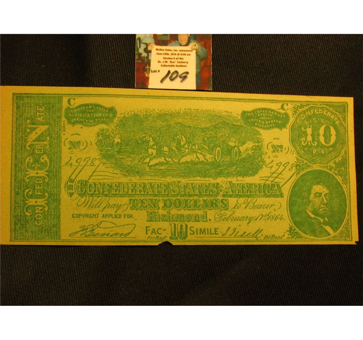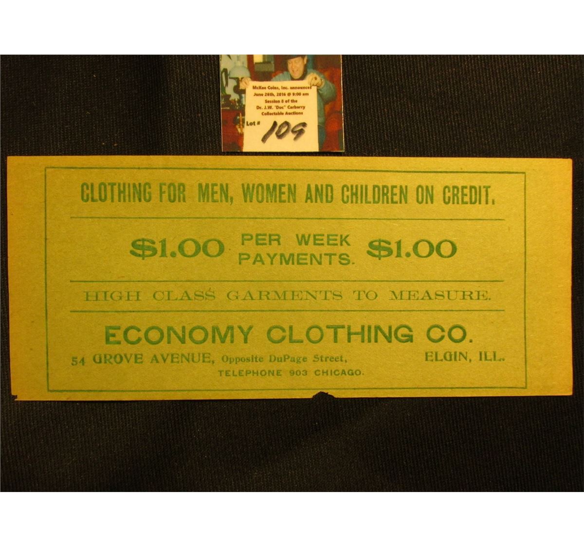 "Economy Clothing Co. Elgin, Ill." Advertising on a facsimile Confederate States of America $10 Note