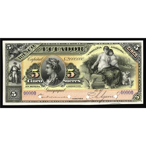 <B>Ecuador</B></I> 5 Sucres 18__ Pick S157A UNL Face Proof<BR>Four punch cancels were made through the signatures of this attractive ABNCo proof that is not listed in the Krause reference as such. It is mounted on card stock and "Dec 1892' is pencilled in on the back. <B>Gem Crisp Uncirculated.</B></I>