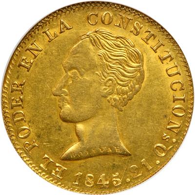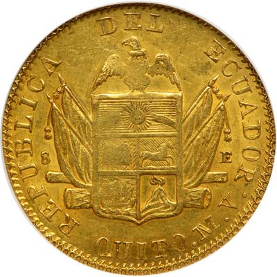 Ecuador. 8 Escudos, 1845-Quito MV. Fr-7; KM-31. Republic. Flag-draped national arms with 8 - E at left and right. Reverse: Bare bust of Simon Bolivar to left with BOLIVAR on truncation of neck. Variety without the flag poles below the arms. This is the second variety of this very rare type. This type was not in the Eliasberg sale. An NGC graded EF-45 sold in our February 2008 sale for $33,000. This higher graded piece is among the finest known for the type. NGC graded AU-55.
