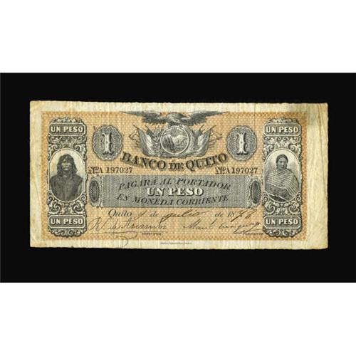 <B>Ecuador</B></I> Banco de Quito 1 Peso July 9, 1878 Pick S236a<BR> This complete date is currently unlisted in the <I>Standard Catalog</B></I> but this example is the plate note in the Specialized volume. The note is printed by Charles, Skipper & East, London. Current value is unlisted in any grade so any estimate is but a guess. <BR><BR><b>Shipping:</b> Coins & Currency (<a target="_blank" href="http://www.heritageauctions.com/common/shipping.php">view shipping information</a>)
