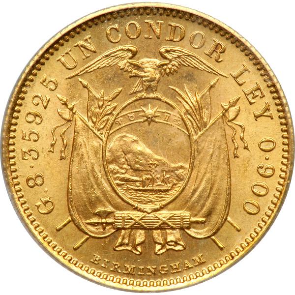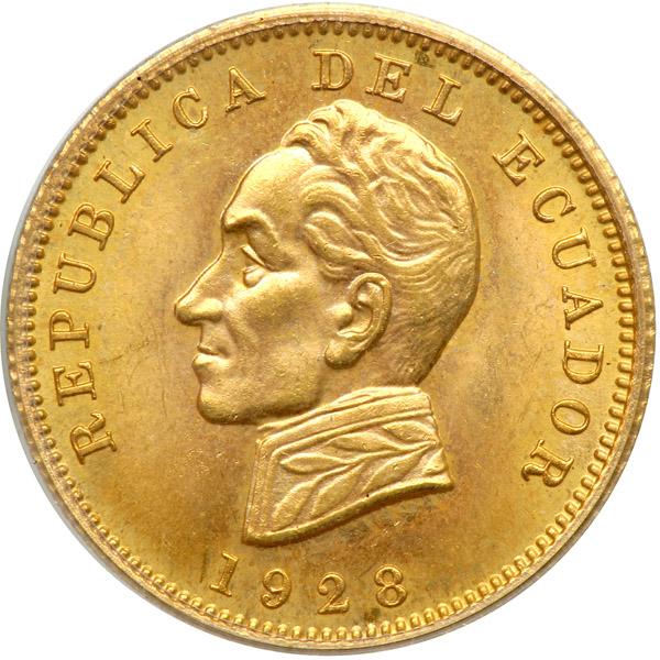 Ecuador. Condor, 1928. Fr-11; KM-74. Head of Bolivar left. Reverse: Flag draped arms. A choice example. PCGS graded MS-65.