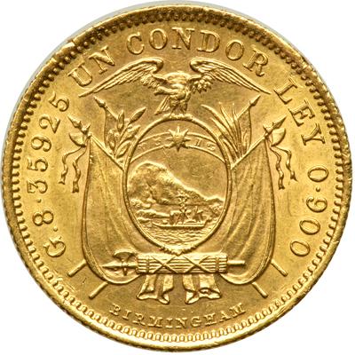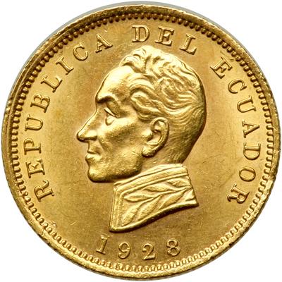 Ecuador. Condor, 1928. Fr-11; KM-74. Birmingham mint. Head of Bolivar left. Reverse: Arms. One year type. NGC graded MS-61.