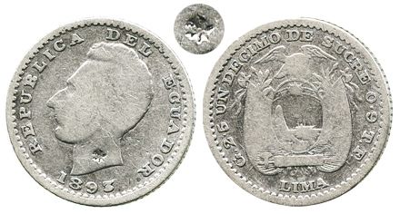 Ecuador (struck in Lima, Peru), 1 decimo, 1893-LIMA, with small star countermark for the Galapagos Islands (?) on obverse. KM-50.3. 2.4 grams. Problem-free Fine, the tiny countermark not overly uncommon but not fully attributed.