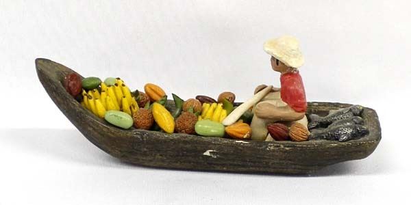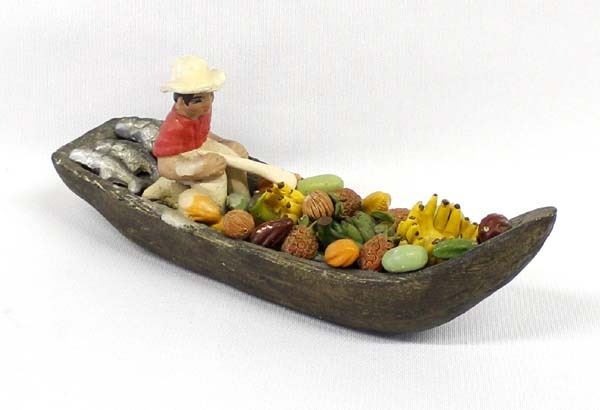 Ecuadorian Pottery Vendor in Canoe, measures 3.5'' x 7.5'', missing oar on left side of canoe