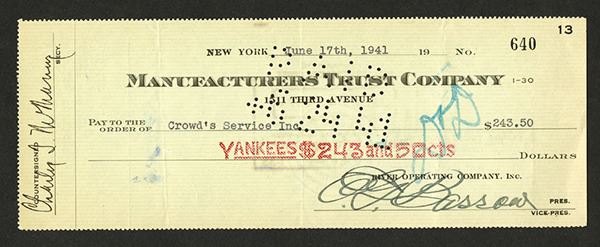 New York, June 17th, 1941, Issued and cancelled check for $243.50. Payment for Ushering Services Yankee Stadium, B.B. Games 6/14 and 6/15. Signed by Superintendent Charlie McManus on back, front with Ed Barrow's signature as Vice President. Barrow was a manager and front office executive in Major League Baseball. He served as the field manager of the Detroit Tigers and Boston Red Sox. He served as business manager (de facto general manager) of the New York Yankees from 1921 to 1939 and as team president from 1939 to 1945, and is credited with building the Yankee dynasty. Barrow was elected to the Baseball Hall of Fame in 1953.