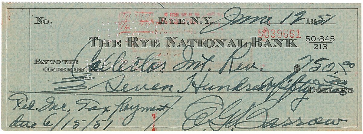 Bank check, 7.75 x 2.75, filled out and signed by Barrow, “E. G. Barrow,” payable to Collector Internal Revenue for $750.00, June 12, 1951, with “Feb. Inc. Tax Payment, date 6/15/51,” penned in the notes field. Light toning, a faint paperclip impression to the top edge, and cancellation stamps and holes, none of which affect the grandiose signature, otherwise fine condition.