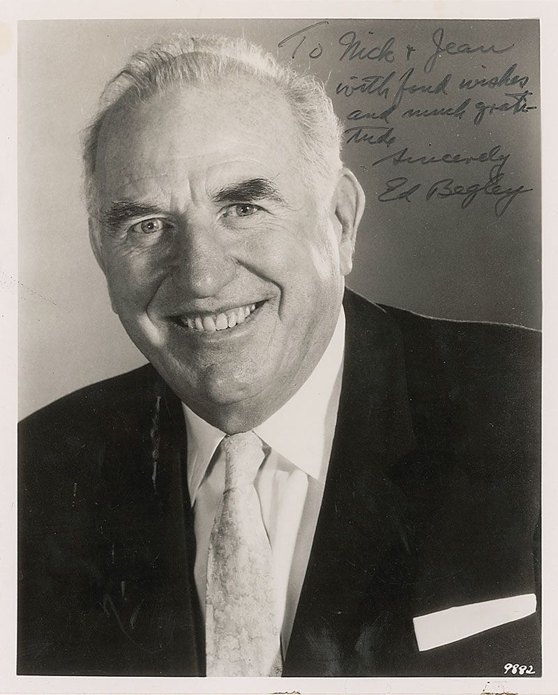 Glossy 8 x 10 head-and-shoulders photo, signed and inscribed in black felt tip “To Nick & Jean, with fond wishes and much gratitude, Sincerely, Ed Begley.” In very good condition, with scattered bends and creases and a few small tears to bottom edge.