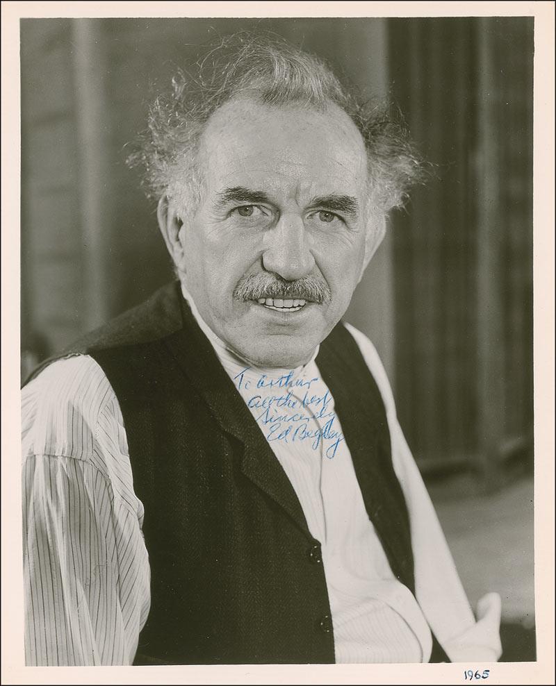 He won the Academy Award for Best Supporting Actor for his role in Sweet Bird of Youth (1962). His other notable films include 12 Angry Men (1957) and The Unsinkable Molly Brown (1964). He also worked extensively in television. Glossy 8 x 10 photo, signed and inscribed in blue ballpoint “To Arthur, All the best, Sincerely, Ed Begley,” and dated 1965 in the lower border in another hand. Some scattered light surface marks and creases, one to facial area, otherwise fine condition.
