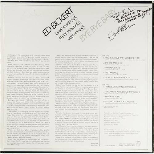 <B>Ed Bickert and Dave McKenna Signed Record and Photo Group.</B></I> Canadian guitarist Ed Bickert is joined by pianist Dave McKenna in this lot. The group includes: "Bye Bye Baby - Ed Bickert" (Concord Jazz CJ-232) with its cover signed by Ed Bickert and Dave McKenna (and a signed photo of McKenna). <I>Accompanied by LOA from PSA/DNA.</B></I> <I>From the Al White Jazz autograph archive.</B></I>