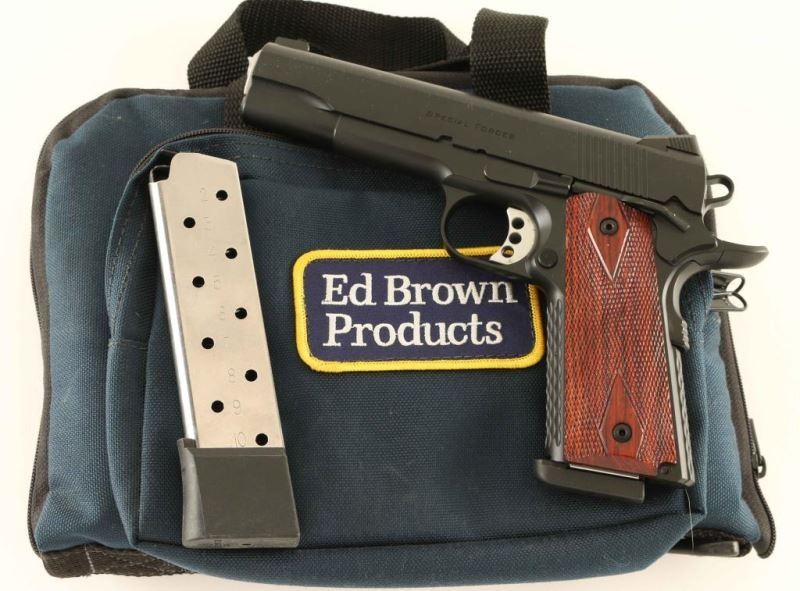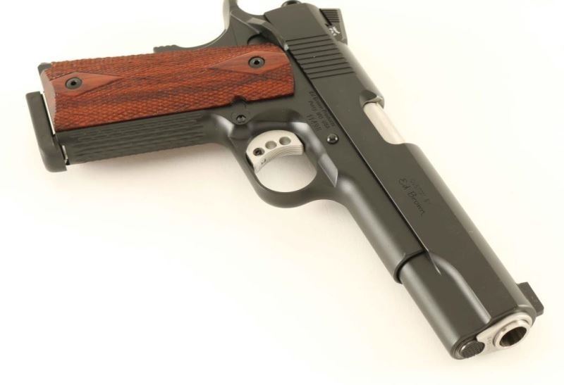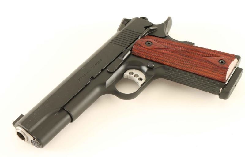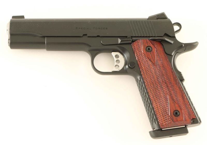 Top quality 1911A1 pattern single action semi-automatic pistol chambered in .45 Auto. Features a black Gen 4 finish, 5" barrel, dovetailed low-profile three-dot night sights, serrated adjustable trigger, skeletonized hammer with serrated spur, ambidextrous safety on the frame, extended beavertail grip safety, push button magazine release, 7 round magazine with extended floorplate, 'chainlink' textured front strap, beveled magazine well, 'chainlink' textured straight mainspring housing and two-piece double diamond checkered Cocobolo grips. Includes a factory padded soft case with manual, lubricant and two 10 round Checkmate magazines. Pistol exhibits approximately 99% of it's original finish showing very minor edge wear and slide wear on the barrel, Action is super smooth, the bore is pristine and the wood grips are fine. Condition is NRA Excellent in case. ***Modern Firearm***